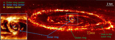 This discovery was reported in the October 19 issue of the journal Nature. Dramatic proof of the galactic smash-up came from images taken by the Infrared Array Camera (IRAC) on NASA's Spitzer Space Telescope. Those images revealed a never-before-seen dust ring deep within the Andromeda galaxy. When combined with a previously observed outer ring, the presence of both dust rings suggests a long-ago disturbance whose effects are still expanding outward through Andromeda. "These dust rings are like ripples in a pond," said David Block (University of the Witwatersrand, Johannesburg), who is the lead author on the paper. "Plop a stone into water and you get an expanding series of rings or waves. Let a small galaxy collide nearly head-on with a larger one, and you will see waves or rings of gas and dust that propagate outward as a result of the violent gravitational interaction." "While our Atlantic Ocean was still forming, Messier 32 plowed head-long into Andromeda's disk of gas and stars," he added. "Only roaming dinosaurs saw the crash and held the secret, until the Spitzer Space Telescope spilled the beans." Research team members Frederic Bournaud and Francoise Combes (Observatoire de Paris) conducted a series of computer simulations to model the collision between Andromeda and M32. They found that M32 plunged through Andromeda's disk along the galaxy's polar axis approximately 210 million years ago. Since M32 is much less massive than Andromeda, the latter was not substantially disrupted, but the smaller galaxy lost more than half its initial mass in the course of the collision. "To continue the hit-and-run analogy, you could compare M32 to a compact car while Andromeda would be an 18-wheeler," explained Barmby. "In a collision between the two, the truck would be almost unharmed while the car would be wrecked. Similarly, M32 was much more damaged than Andromeda." Astronomers have predicted that Andromeda and the Milky Way will collide in approximately 5 to 10 billion years. That collision will erase the separate identities of each galaxy, leaving a single elliptical galaxy in their place. This discovery was made with Spitzer's Infrared Array Camera, built primarily at NASA Goddard Space Flight Center in Greenbelt, Maryland. The instrument's principal investigator is Giovanni Fazio of CfA. The Jet Propulsion Laboratory, in Pasadena, California, manages the Spitzer Space Telescope mission for NASA's Science Mission Directorate, Washington. Science operations are conducted at the Spitzer Science Center at the California Institute of Technology in Pasadena. Headquartered in Cambridge, Mass., the Harvard-Smithsonian Center for Astrophysics (CfA) is a joint collaboration between the Smithsonian Astrophysical Observatory and the Harvard College Observatory. CfA scientists, organized into six research divisions, study the origin, evolution and ultimate fate of the universe. |