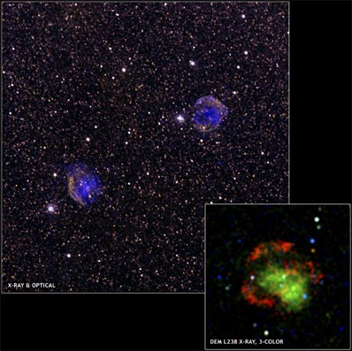 A white dwarf, the dense final stage in the evolution of a sun-like star, is a very stable object and will not explode on its own. However, if a white dwarf has a close companion star it can grow beyond a critical mass by pulling gas off the companion and explode. Computer simulations of Type Ia supernova remnants showed that the most likely explanation for the X-ray data is that the white dwarfs exploded into very dense environments. This suggests that the stars tht evolved into these white dwarfs were more massive than usual, because heavier stars are known to expel more gas into their surroundings. "We know that the more massive a star is, the shorter its lifetime," said Kazimierz Borkowski of North Carolina State University, Raleigh. "If such a star could also begin to pull matter from its companion at an early stage, then this star would have a much shorter fuse and explode in only about 100 million years -- much less than other Type Ia supernovas." Other teams have independently found evidence for prompt Type Ia explosions using optical observations, but at much greater distances where the environment of the stellar explosion cannot be probed. The X-ray data of DEM L238 and DEM L249 represent nearby examples of prompt Type Ia supernovas. "We still need to know more about the details of these explosions since they are such an important tool for studying cosmology," said Stephen Reynolds also of North Carolina State University. "So, it's exciting to discover we have some really nearby examples, astronomically speaking, of this different class of explosion." The luminosity of Type Ia explosions is thought to be very consistent from star to star, and astronomers have used observations of Type Ia supernovas in optical light as cosmic mile markers to study the accelerating expansion of the cosmos caused by dark energy. If Type Ia supernovas can occur so quickly, they can exist much earlier in the Universe's history than generally believed, allowing them to probe the expansion at these epochs. Another possibility is that the prompt Type Ia's may also differ in other properties. If so, the assumption that Type Ia's are standard candles may be compromised, complicating attempts to study dark energy. "We weren't around to see these stars before they exploded," said Sean Hendrick of Millersville University, Penn., "but these X-ray clues tell us that something unusual happened in the case of these two." After finding this evidence for prompt Type Ia explosions in the Large Magellanic Cloud, a nearby galaxy, the researchers are looking at other supernova remnants within the Milky Way to see if they might be examples of this potential new class. For example, the famous supernova observed by Johannes Kepler in 1604 might have been a prompt Type Ia supernova. NASA's Marshall Space Flight Center, Huntsville, Ala., manages the Chandra program for the agency's Science Mission Directorate. The Smithsonian Astrophysical Observatory controls science and flight operations from the Chandra X-ray Center, Cambridge, Mass. |
