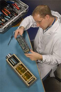 GeneSat shows small craft can deliver big science NASA-AMES NEWS RELEASE Posted: January 15, 2007 MOFFETT FIELD, Calif. -- A very small NASA satellite has proven that scientists can quickly design and launch a new class of inexpensive spacecraft -- and conduct significant science. The 11-pound (5-kilogram) GeneSat-1, carrying bacteria inside a miniature laboratory, was launched on Dec. 16, 2006. It was a secondary payload on an Air Force four-stage Minotaur 1 rocket that delivered the Air Force TacSat 2 satellite to orbit. GeneSat-1 began to transmit data on its first pass over the mission's California ground station. Scientists still receive data from the satellite regularly.