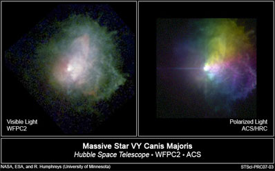 A team of astronomers led by Roberta Humphreys of the University of Minnesota used NASA's Hubble Space Telescope and the W.M. Keck Observatory to measure the motions of the ejected material and to map the distribution of the highly polarized dust, which reflects light at a specific orientation. The polarized light shows how the dust is distributed. Astronomers combined the Hubble and Keck information to produce a three-dimensional image of the matter emitted from VY Canis Majoris. "We thought mass loss in red supergiants was a simple, spherical, and uniform outflow, but in this star it is very complex," Humphreys said. "VY Canis Majoris is ejecting large amounts of gas at a prodigious rate and is consequently one of our most important stars for understanding the high-mass loss episodes near the end of massive star evolution. During the outbursts, the star loses about 10 times more mass than its normal rate. "With these observations, we have a complete picture of the motions and directions of the outflows, and their spatial distribution, which confirms their origin from eruptions at different times from separate regions on the star." Humphreys and her collaborators presented their findings at the American Astronomical Society meeting in Seattle, Wash. Astronomers have studied VY Canis Majoris for more than a century. The star is located 5,000 light-years away. It is 500,000 times brighter and about 30 to 40 times more massive than the Sun. If the Sun were replaced with the bloated VY Canis Majoris, its surface could extend to the orbit of Saturn. Images with Hubble's Wide Field and Planetary Camera 2 revealed for the first time the complexity of the star's ejecta. The first images provided evidence that the brightest arcs and knots were created during several outbursts. The random orientations of the arcs also suggested that they were produced by localized eruptions from active regions on the star's surface. With spectroscopy obtained using the Keck Telescope, Humphreys and her team learned more about the shape, motion, and origin of the star's outflow. Line of sight velocities, measured from the spectra, showed that the arcs and knots were expanding relative to the star. With recently obtained Hubble images, the group measured the ejecta's motions across the line of sight. The team found that the numerous arcs, loops, and knots were moving at different speeds and in various directions, confirming they were produced from separate events and from different locations on the star. The astronomers also used the measurements to determine when the outbursts happened. The outermost material was ejected about 1,000 years ago, while a knot near the star may have been ejected as recently as 50 years ago. The arcs and knots represent massive outflows of gas probably ejected from large star spots or convective cells on the star's surface, analogous to the Sun's activity with sunspots and prominences associated with magnetic fields, but on a vastly larger scale. Magnetic fields have been measured in VY Canis Majoris's ejecta that correspond to field strengths on its surface comparable to the magnetic fields on the Sun. These measurements show that the supergiant star's magnetic fields would supply sufficient energy for these massive outflows. The astronomers used the measurements to map the velocity and direction of the outflows with respect to the embedded star. When combined with the dust distribution map, they also determined the location of the arcs and knots, yielding the three-dimensional shape of VY Canis Majoris and its ejecta. "With these observations, we may have captured a short-lived phase in the life of a massive star," Humphreys said. "The most luminous red supergiants may all eventually experience high-mass loss episodes like VY Canis Majoris before ending their lives." The typical red supergiant phase lasts about 500,000 years. A massive star becomes a red supergiant near the end of its life, when it exhausts the hydrogen fuel at its core. As the core contracts under gravity, the outer layers expand, the star gets 100 times larger, and it begins to lose mass at a higher rate. VY Canis Majoris has probably already shed about half of its mass, and it will eventually explode as a supernova. |