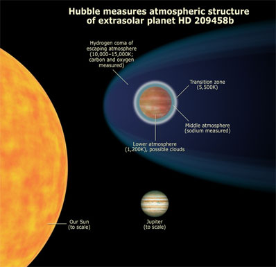 Hubble probes structure of alien world's atmosphere SPACE TELESCOPE SCIENCE INSTITUTE NEWS RELEASE Posted: January 31, 2007 The powerful vision of NASA's Hubble Space Telescope has allowed astronomers to study for the first time the layer-cake structure of the atmosphere of a planet orbiting another star. Hubble discovered a dense upper layer of hot hydrogen gas where the super-hot planet's atmosphere is bleeding off into space.