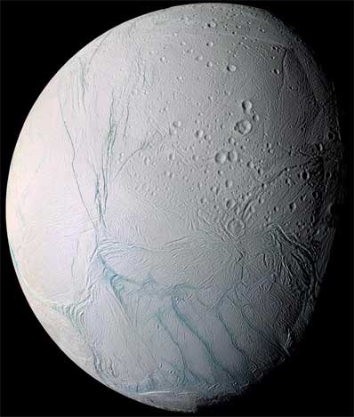 The ice jets of Enceladus send particles streaming into space hundreds of kilometers above the south pole of this spectacularly active moon. Credit: NASA/JPL/Space Science Institute