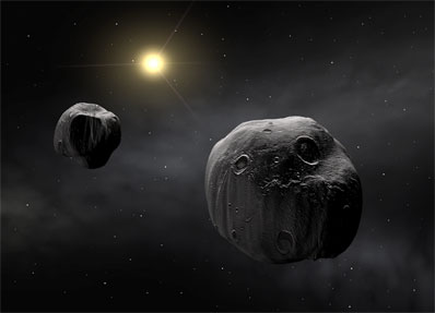 This new view of Antiope is the culmination of research that started in 2003 and that eventually included data supplied by both professional and amateur astronomers from around the globe. Before the year 2000, Antiope was just another main-belt asteroid, one of millions between the orbits of Mars and Jupiter. But that year, it was resolved into a doublet, thanks to sharper pictures obtained with adaptive optics (AO) on the largest ground-based telescope, the 10-meter Keck II telescope in Hawaii. Yet, even with AO, these two asteroids were too small for astronomers to discern their shape or to see more than two bright blobs revolving around their center of mass. Two years ago, with improved images from the European Southern Observatory's 8-meter Very Large Telescope (VLT) in Chile and Keck II, University of California, Berkeley astronomer Franck Marchis and colleagues in France were able to determine the approximate orbit of the two asteroids, each of them about 86 kilometers in diameter and separated by about 171 kilometers. But uncertainties remained, and in 2005 the team invited observers around the world to turn their telescopes on the asteroid pair during a time when they predicted a mutual eclipse or occultation would cause a drop in brightness. In an eclipse, one of the pair casts a shadow over the other; in an occultation, one passes in front of, and completely blocks light from, the other. Sure enough, at the appointed time on May 31, 2005, one of the asteroids eclipsed the other, and team member Tadeusz Michalowski e-mailed Marchis and their colleagues from South Africa to confirm the eclipse. Michalowski, an astronomer at Adam Michiewicz University's Astronomical Observatory in Poznan, Poland, recorded the dip in Antiope's brightness from the South African Astronomical Observatory. Over the next six months, at Marchis' invitation, amateurs and professionals from as far afield as Brazil, France, Reunion Island in the Indian Ocean and Grass Valley, Calif., observed repeated occultations, as well as shadows passing over one of the pair. "This is the first publication I've had in a professional journal, and I'm really happy about it," said amateur astronomer Peter Dunckel, 75, a retired paper company executive who observes from the backyard of his vacation home in Grass Valley. "What is really a thrill is to have my little 7-inch telescope along with an 8-meter telescope on the same paper; it is unbelievable." Dunckel observed the binary pair for 35 hours over a period of six weeks, recording Antiope's brightness every minute with a CCD camera attached to his Maksutov Newtonian reflector telescope. "Amateurs can be used for professional studies, compensating for the small size of their telescopes by the large numbers of observations and the frequency of observations they can do," Marchis said. "You can time the orbits more precisely when a mutual event happens, which allows you to extract also the size, shape and surface detail of each component, and also what it's made of." The asteroid pair is itself the remnant of an ancient asteroid, dubbed Themis, which astronomers estimate was destroyed around 2.5 million years ago, probably hit by another asteroid. The rubble spread out from the point of impact but continued to follow approximately the same orbit around the sun in the outer part of the main asteroid belt. Themis was a carbonaceous chondrite left over from the formation of the solar system 2.5 billion years ago. Evidently, either another asteroid hit Antiope again to split it in two, or two of the Themis pieces remained bound to one another after the initial break up, possibly even remaining attached. However the doublet arose, computer simulations by another group suggest that the spinning, elongated rubble pile would have separated into two egg-shaped rubble piles, each the shape of a Roche ellipsoid, the theoretical shape predicted for a system if their composition was liquid or loosely aggregated, rather than solid, and if the components are deformed due to mutual gravitation. The eclipse and occultation observations, combined with previous observations of Antiope during a grazing occultation, confirmed the ellipsoid shape of each component of the asteroid, Marchis said. Each component differs from a sphere by less than 7 percent, or 6 kilometers out of 86. They orbit around their center of mass every 16.5 days "Due to mutual gravitation, both components took a shape very close to the pure hydrostatic shape, the Roche ellipsoid, as if the asteroid was a fluid," Marchis said. "This result indicates that the internal strength in the components must be low, so possibly a rubble pile structure." They were able to calculate the density as 1.25 grams per cubic centimeter (water is one gram per cubic centimeter), which, if one assumes that the rock component is carbonaceous chondrite, means the asteroid pair is 30 percent empty space. "Despite this intensive study, the origin of this unique doublet still remains a mystery," said team member Pascal Descamps, an astronomer at the Institut de Mecanique Celeste et de Calculs des Ephemerides (IMCCE) of the Observatoire de Paris. "The formation of such a large double system is an improbable event and represents a formidable challenge to theory. It is possible that a parent body was spun up so much that it broke apart, but this seems very hard to do for asteroids in the main belt, unlike, for example, near-Earth asteroids." Marchis and his team are employing both amateur and professional astronomers to observe more of these mutual events between components of binary asteroid systems. These partnerships are a powerful way to get direct and accurate insights about these systems, he said. As for Dunckel, who commutes from San Francisco to the Grass Valley vacation home he refers to as "Rattlesnake Creek Observatory," he says he's hooked on scientific amateur observing, "now that I've broken the dam, so to speak." He has upgraded to a 10-i