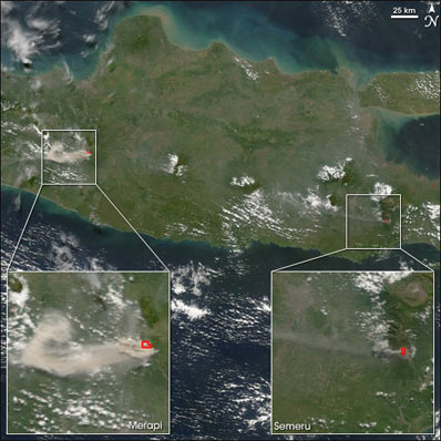 While scientists have long debated whether earthquakes can trigger new volcanic eruptions, this study linked an earthquake to enhanced volcanic activity at two ongoing eruptions that were being closely monitored by satellite-based sensors on a daily basis. At the time of the earthquake, each volcano was being checked for changes in heat output by satellite sensors as part of a routine global "hot spot" monitoring effort that uses near real-time satellite data from NASA's Terra and Aqua satellites. Maps of worldwide hot spot activity are created with data from the Moderate Resolution Imaging Spectroradiometer (MODIS) instrument on these satellites, pinpointing locations where surface temperatures are much hotter than their surroundings. The scientists combined these data with other details about the Indonesian volcanoes gathered by the satellites to analyze temperature and lava output rates at both volcanoes over a 35-day period spanning the earthquake. The two volcanoes, Merapi and Semeru, are about 260 kilometers (162 miles) apart and roughly 50 kilometers (31 miles) north and 280 kilometers (174 miles) east of the earthquake epicenter, respectively. Given these distances, the researchers believe underground stresses from the earthquake's seismic waves likely acted to pump magma -- molten rock beneath the surface -- into the conduit to the surface, ultimately increasing eruption rates. "The responses at Merapi and Semeru lagged about three days behind the triggering earthquake, which may reflect the time it took the change felt by magma residing at deeper levels to be transmitted to the surface," said Harris. The researchers concluded that regional earthquake events have sufficient power to modify the intensity of activity at ongoing eruptions, although they may not always be able to trigger new volcanic eruptions. They also noted that the Java earthquake had a significant influence on the volcanoes for a relatively short period of several days, suggesting that catching the effect of a quake on an eruption requires careful observation. "Eruptions must be closely and continuously monitored in the days immediately before, during and after an earthquake if we are to link any earthquake with enhanced volcanic activity," added Harris. Satellite monitoring may be able to play a predictive role in eruptions, rather than just its more traditional responsive role, according to the study. Instruments on today's advanced satellites are providing new and considerably more data to help scientists better track and understand volcanic eruptions. "The satellite data we have now -- from MODIS, NASA's Advanced Spaceborne Thermal Emission and Reflection Radiometer and the Landsat-7 satellite -- give us fresh insights into the behavior of volcanic systems around the entire globe," said Harris. "This worldwide perspective would not have been possible using ground-based sensors; there are too many unmonitored sectors and periods. We simply could not have uncovered our results without the continuous and global data provided by MODIS." The researchers are currently reviewing older MODIS hot spot data, which extends back to 2000, to uncover additional earthquake-induced responses at erupting volcanoes in hope of identifying patterns that might be used to build a predictive model for forecasting earthquake-induced changes in activity at erupting volcanoes. |