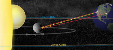 Margot and collaborators conducted a series of observations over five years using a novel technique to detect tiny twists in Mercury's spin as it orbits the sun. The twists, called longitudinal librations, occur as the sun's gravity exerts alternating torques on the planet's slightly asymmetrical shape. They found that the magnitude of the librations was double what would be expected for a completely solid body -- but explainable for an object whose core is molten and not forced to rotate along with its shell. Mercury is thought to consist of a silicate mantle surrounding an iron core, but because small planets like Mercury cool off rapidly, the core should have frozen long ago. Maintaining a molten core over billions of years requires that it also contain a lighter element, such as sulfur, to lower the melting temperature of the core material. The presence of sulfur supports the idea that radial mixing, or the combining of elements both close to the sun and farther away, was involved in Mercury's formation process. A molten core also gives weight to the idea that Mercury's magnetic field, which is about 1 percent as strong as Earth's, is caused by an electromagnetic dynamo. The researchers used three telescopes -- the NASA/JPL 70-meter antenna at Goldstone, Calif.; and the National Science Foundation's Arecibo Observatory in Puerto Rico and Robert C. Byrd Green Bank Telescope in West Virginia -- to measure slight changes in Mercury's spin. The system involved sending a powerful radar signal at the planet, then receiving the signal's echo, which appeared as a unique pattern of speckles reflecting the roughness of the planet's surface, at two locations separated by about 2,000 miles. Measuring how long it took for a particular speckle pattern to reproduce at the two locations (about 10 seconds) allowed Margot to calculate Mercury's spin rate with an accuracy of one part in 100,000. The experiment included 21 such measurements, very carefully timed since Mercury and Earth are only in the necessary alignment for periods of 20 seconds at a time. "Everything has to happen within that 20-second time window," Margot said. Mercury's spin is a subject the paper's second author, University of California-Santa Barbara physics professor emeritus Stan Peale, first studied as a graduate student at Cornell decades ago. In the years since, Peale showed that Mercury's interior could be characterized in detail if four properties could be determined: the libration amplitude; the planet's obliquity, or the inclination angle of its rotational axis in relation to its orbital plane; and two values called gravitational harmonic coefficients. Peale's formula also required that Mercury be in a Cassini state, a stable orbital configuration that characterizes the end of tidal evolution. Finding those properties from Earth was long thought to be impossible. But this unusual radar technique (the method was first proposed to determine the spin rate in the 1960s; its use for finding the spin orientation was proposed by co-author I.V. Holin about two decades later) allowed the researchers to measure the planet's librations and obliquity -- and to show that Mercury is almost certainly in the required Cassini state. Mercury still has its share of mysteries. Some may be solved with the NASA spacecraft Messenger, though, launched in 2004 and expected to make its first Mercury flyby in 2008. The spacecraft will begin orbiting the planet in 2011. "It is our hope that Messenger will address the remaining questions that we cannot address from the ground," Margot said. The paper's other authors are R.F. Jurgens and M.A. Slade of NASA's Jet Propulsion Laboratory. |
