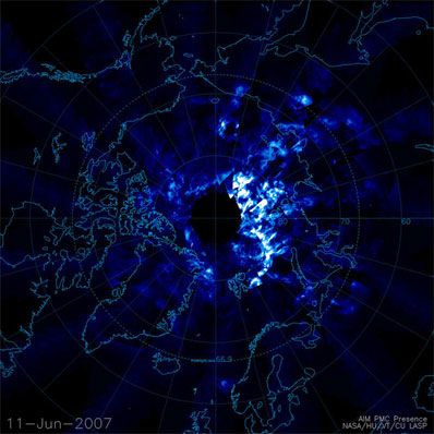 AIM spacecraft gets its first look night-shining clouds NASA NEWS RELEASE Posted: July 1, 2007 WASHINGTON -- A NASA satellite has captured the first occurrence this summer of mysterious iridescent polar clouds that form 50 miles above Earth's surface. The first observations of these clouds by the Aeronomy of Ice in the Mesosphere (AIM) satellite occurred above 70 degrees north on May 25. Observers on the ground began seeing the clouds on June 6 over northern Europe. AIM is the first satellite mission dedicated to the study of these unusual clouds.