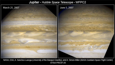 Hubble catches Jupiter changing its stripes SPACE TELESCOPE SCIENCE INSTITUTE NEWS RELEASE Posted: July 9, 2007 Massive Jupiter is undergoing dramatic atmospheric changes that have never been seen before with the keen "eye" of NASA's Hubble Space Telescope. Jupiter's turbulent clouds are always changing as they encounter atmospheric disturbances while sweeping around the planet at hundreds of miles per hour. But these Hubble images reveal a rapid transformation in the shape and color of Jupiter's clouds near the equator, marking an entire face of the globe.