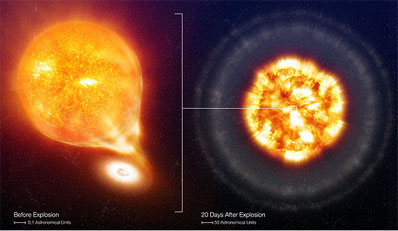 Evidence provided for type of supernova scenario EUROPEAN SOUTHERN OBSERVATORY NEWS RELEASE Posted: July 14, 2007 A unique set of observations, obtained with the European Southern Observatory's VLT, has allowed astronomers to find direct evidence for the material that surrounded a star before it exploded as a Type Ia supernova. This strongly supports the scenario in which the explosion occurred in a system where a white dwarf is fed by a red giant. Because Type Ia supernovae are extremely luminous and quite similar to one another, these exploding events have been used extensively as cosmological reference beacons to trace the expansion of the Universe. However, despite significant recent progress, the nature of the stars that explode and the physics that governs these powerful explosions have remained very poorly understood.