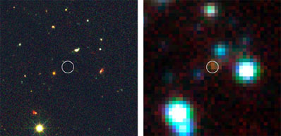 The galaxy, called GOODS 850-5, is 12 billion light-years from Earth, and thus is seen as it was only about 1.5 billion years after the Big Bang. Wang and his colleagues observed it using the Smithsonian Astrophysical Observatory's Submillimeter Array (SMA) on Mauna Kea in Hawaii. Young stars in the galaxy were enshrouded in dust that was heated by the stars and radiated infrared light strongly. Because of the galaxy's great distance from Earth, the infrared light waves have been stretched out to submillimeter-length radio waves, which are seen by the SMA. The waves were stretched or "redshifted," as astronomers say, by the ongoing expansion of the Universe. "This evidence for prolific star formation is hidden by the dust from visible-light telescopes," Wang explained. The dust, in turn, was formed from heavy elements that had to be built up in the cores of earlier stars. This indicates, Wang said, that significant numbers of stars already had formed, then spewed those heavy elements into interstellar space through supernova explosions and stellar winds. "Seeing the radiation from this heated dust revealed star formation we could have found in no other way," Wang said. Similar dusty galaxies in the early universe may contain most of the star formation at those times. "This means that future telescopes such as the Atacama Large Millimeter Array (ALMA) can reveal many more such galaxies and give us a much more complete picture of star formation in the early universe," he added. Lennox Cowie of the University of Hawaii said, "We found out in the last decade that most of the recent star formation in the Universe occurs in large dusty galaxies, but we had always expected that early star formation would be dominated by smaller and less obscured galaxies. Now it seems that even at very early times it may be the same big dusty star formers that are the sites of most of the star formation. That's quite a surprise." Astronomers believe that large galaxies originally formed through mergers of smaller objects. Seeing a large galaxy such as GOODS 850-5 forming stars so rapidly at such an early time in the history of the universe is a surprise. "Either the mergers that formed the galaxy happened much faster than we thought or some other process altogether produced the galaxy," Wang said. Wang and Cowie worked with Jennifer van Saders of Rutgers University and NRAO, Amy Barger of the University of Wisconsin-Madison, and Jonathan Williams of the University of Hawaii. The scientists published their findings in the December 1 edition of the Astrophysical Journal. The National Radio Astronomy Observatory is a facility of the National Science Foundation, operated under cooperative agreement by Associated Universities, Inc. The Submillimeter Array is an 8-element interferometer located atop Mauna Kea in Hawaii. It is a collaboration between the Smithsonian Astrophysical Observatory and the Institute of Astronomy and Astrophysics of the Academia Sinica of Taiwan. Headquartered in Cambridge, Mass., the Harvard-Smithsonian Center for Astrophysics (CfA) is a joint collaboration between the Smithsonian Astrophysical Observatory and the Harvard College Observatory. CfA scientists, organized into six research divisions, study the origin, evolution and ultimate fate of the universe. |