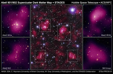 The images are part of the Space Telescope Abell 901/902 Galaxy Evolution Survey (STAGES), which covers one of the largest patches of sky ever observed by the Hubble telescope. The area surveyed is so wide that it took 80 Hubble images to cover the entire STAGES field. The new work is led by Meghan Gray of the University of Nottingham in the United Kingdom and Catherine Heymans of the University of British Columbia in Vancouver, along with an international team of scientists. The Hubble study pinpointed four main areas in the supercluster where dark matter has pooled into dense clumps, totaling 100 trillion times the Sun's mass. These areas match the location of hundreds of old galaxies that have experienced a violent history in their passage from the outskirts of the supercluster into these dense regions. These galaxies make up four separate galaxy clusters. "Thanks to Hubble's Advanced Camera for Surveys, we are detecting for the first time the irregular clumps of dark matter in this supercluster," Heymans said. "We can even see an extension of the dark matter toward a very hot group of galaxies that are emitting X-rays as they fall into the densest cluster core." The dark matter map was constructed by measuring the distorted shapes of over 60,000 faraway galaxies. To reach Earth, the galaxies' light traveled through the dark matter that surrounds the supercluster galaxies and was bent by the massive gravitational field. Heymans used the observed, subtle distortion of the galaxies' shapes to reconstruct the dark matter distribution in the supercluster using a method called weak gravitational lensing. The dark matter map is 2.5 times sharper than a previous ground-based survey of the supercluster. "The new map of the underlying dark matter in the supercluster is one key piece of this puzzle," Gray explained. "At the same time we're looking in detail at the galaxies themselves." The survey's broader goal is to understand how galaxies are influenced by the environment in which they live. On Earth, the pace of quiet country life is vastly different from the hustle of the big city. In the same way, galaxies living lonely isolated lives look very different from those found in the most crowded regions of the universe, like a supercluster. "We've known for a long time that galaxies in crowded environments tend to be older, redder, and rounder than those in the field," Gray said. "Galaxies are continually drawn into larger and larger groups and clusters by the inevitable force of gravity as the universe evolves." In such busy environments galaxies are subject to a life of violence: high-speed collisions with other galaxies; the stripping away of gas, the fuel supply they use to form new stars; and distortion due to the strong gravitational pull of the underlying invisible dark matter. "Any or all of these effects may play a role in the transformation of galaxies, which is what we're trying to determine," Gray said. The STAGES survey's simultaneous focus on both the big picture and the details can be likened to studying a big city. "It's as if we're trying to learn everything we can about New York City and New Yorkers," Gray explained. "We're examining large-scale features, like mapping the roads, counting skyscrapers, monitoring traffic. At the same time we're also studying the residents to figure out how the lifestyles of people living downtown differ from those out in the suburbs. But in our case the city is a supercluster, the roads are dark matter, and the people are galaxies." Further results by other team members support this view. "In the STAGES supercluster we clearly see that transformations are happening in the outskirts of the supercluster, where galaxies are still moving relatively slowly and first feel the influence of the cluster environment," said Christian Wolf, an Advanced Research Fellow at the University of Oxford in the U.K. Assistant professor Shardha Jogee and graduate student Amanda Heiderman, both of the University of Texas in Austin, concur. "We see more collisions between galaxies in the regions toward which the galaxies are flowing than in the centers of the clusters," Jogee said. "By the time they reach the center, they are moving too fast to collide and merge, but in the outskirts their pace is more leisurely, and they still have time to interact." The STAGES team also finds that the outer parts of the clusters are where star formation in the galaxies is slowly switching off and where the supermassive black holes at the hearts of the galaxies are most active. Added Heiderman: "The galaxies at the centers of the clusters may have been there for a long time and have probably finished their transformation. They are now old, round, red, and dead." The team plans more studies to understand how the supercluster environment is responsible for producing these changes. Abell 901/902 resides 2.6 billion light-years from Earth and measures more than 16 million light-years across. This work was supported by the Science and Technology Facilities Council (UK), NASA, the National Science Foundation Long Term Space Astrophysics (NASA LTSA) program, a Marie Curie Fellowship, a CITA National Fellowship, CIfAR, and CFI. |