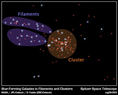 For the first time, Spitzer's supersensitive eyes have caught an infrared glimpse of several galaxies traveling along two filamentary roads into a galaxy cluster called Abell 1763. "This is the first time we've ever seen a filament leading into a cluster with an infrared telescope," says Dario Fadda, of the Herschel Science Center, which is located at the California Institute of Technology in Pasadena, Calif. "Our observations show that the fraction of starburst galaxies in the filaments is more than double the number of starburst galaxies inside the cluster region," he adds. According to Fadda, clusters and the filaments that connect them are among the largest structures in the cosmos. To see them, astronomers need instruments that can map large areas of sky and have the sensitivity to resolve individual galaxies. Luckily, instruments aboard Spitzer can do both. Using the telescope's multiband imaging photometer, Fadda and his colleagues saw structures spanning 23 million light-years. They used the observatory's infrared array camera to collect a census of each galaxy's star formation and used a ground-based telescope at the Kitt Peak National Observatory near Tucson, Ariz. to determine which galaxies belonged to the cluster and surrounding filaments. Ultimately, Fadda found that galaxies in the filaments form stars at a higher rate than their cluster counterparts. "The new Spitzer findings will provide valuable insights into how galaxies grow and change as they leave cosmic suburbia for the big cities," says Fadda. He notes that future infrared missions will be able to follow in Spitzer's footsteps and study how filaments and clusters affect the growth of galaxies in greater detail. One such mission is the European Space Agency's Herschel Space Telescope, which has significant NASA involvement. His paper on this topic has been accepted for publication in Astrophysical Journal Letters. Co-authors on the paper include Andrea Biviano of the INAF/Osservatorio Astronomico di Trieste, Italy; Florence Durret of Institut d'Astrophysique de Paris, France; and Francine Marleau and Lisa Storrie-Lombardi of the Spitzer Science Center, Pasadena, Calif. NASA's Jet Propulsion Laboratory, Pasadena, Calif., manages the Spitzer Space Telescope mission for NASA's Science Mission Directorate, Washington. Science operations are conducted at the Spitzer Science Center at the California Institute of Technology, also in Pasadena. Caltech manages JPL for NASA. |