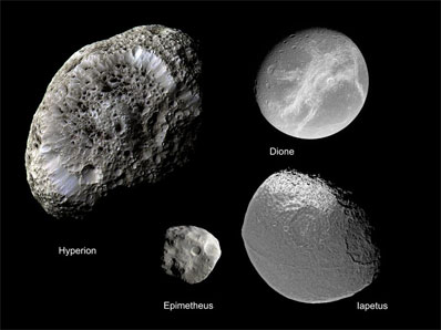 Cassini finds mingling moons may share a dark past NASA/JPL NEWS RELEASE Posted: February 21, 2008 Despite the incredible diversity of Saturn's icy moons, theirs is a story of great interaction. Some of them are pock-marked, some seemingly dirty, others pristine, one spongy, one two-faced, some still spewing with activity and some seeming to be captured from the far reaches of the solar system. Yet many of them have a common thread -- black "stuff" coating their surfaces.