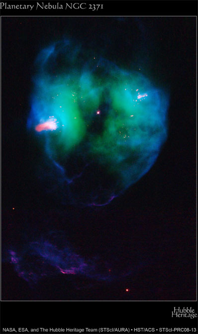 The object, called NGC 2371, is a planetary nebula, the glowing remains of a sun-like star. The remnant star visible at the center of NGC 2371 is the super-hot core of the former red giant, now stripped of its outer layers. Its surface temperature is a scorching 240,000 degrees Fahrenheit. NGC 2371 lies about 4,300 light-years away in the constellation Gemini. The Hubble image reveals several remarkable features, most notably the prominent pink clouds lying on opposite sides of the central star. This color indicates that they are relatively cool and dense, compared to the rest of the gas in the nebula. Also striking are the numerous, very small pink dots, marking relatively dense and small knots of gas, which also lie on diametrically opposite sides of the star. These features appear to represent the ejection of gas from the star along a specific direction. The jet's direction has changed with time over the past few thousand years. The reason for this behavior is not well understood, but might be related to the possible presence of a second star orbiting the visible central star. A planetary nebula is an expanding cloud of gas ejected from a star that is nearing the end of its life. The nebula glows because of ultraviolet radiation from the hot remnant star at its center. In only a few thousand years the nebula will dissipate into space. The central star will then gradually cool down, eventually becoming a white dwarf, the final stage of evolution for nearly all stars. The Hubble picture of NGC 2371 is a false-color image, prepared from exposures taken through filters that detect light from sulfur and nitrogen (red), hydrogen (green), and oxygen (blue). These images were taken with Hubble's Wide Field Planetary Camera 2 in November 2007, as part of the Hubble Heritage program. |