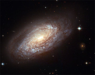 NGC 2397, pictured in this image from Hubble, is a classic spiral galaxy with long prominent dust lanes along the edges of its arms, seen as dark patches and streaks silhouetted against the starlight. Hubble's exquisite resolution allows the study of individual stars in nearby galaxies. Located nearly 60 million light-years away from Earth, the galaxy NGC 2397 is typical of most spirals, with mostly older, yellow and red stars in its central portion, while star formation continues in the outer, bluer spiral arms. The brightest of these young, blue stars can be seen individually in this high resolution view from the Hubble's Advanced Camera for Surveys (ACS). One atypical feature of this Hubble image is the view of supernova SN 2006bc taken when its brightness was on the decrease. Astronomers from Queen's University Belfast in Northern Ireland, led by Professor of Astronomy Stephen J. Smartt, requested the image as part of a long project studying the massive exploding stars ‹ supernovae. Exactly which types of star will explode and the lowest mass of star that can produce a supernova are not known. When a supernova is discovered in a nearby galaxy the group begins a painstaking search of earlier Hubble images of the same galaxy to locate the star that later exploded; often one of hundreds of millions of stars in the galaxy. This is a little like sifting through days of CCTV footage to find one frame showing a suspect. If the astronomers find a star at the location of the later explosion, they may work out the mass and type of star from its brightness and colour. Only six such stars have been identified before they exploded and the Queen's team have discovered the nature of five of them. In their latest work on Hubble images, presented at the UK National Astronomy Meeting 2008 in Belfast, the Queen's team reveals the results of their ten-year search for these elusive supernova precursor stars. It appears that stars with masses as low as seven times the mass of the Sun can explode as supernovae. The team have not found any very massive stars that exploded, suggesting that the most massive stars may collapse to form black holes either without producing a supernova or by producing one that is too faint to observe. |