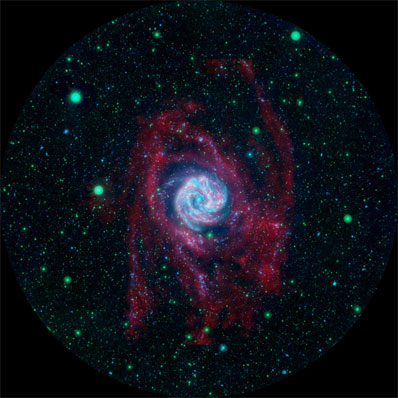 In the new view, the main spiral, or stellar, disk of M83 looks like a pink and blue pinwheel, while its outer arms appear to flap away from the galaxy like giant red streamers. It is within these so-called extended galaxy arms that, to the surprise of astronomers, new stars are forming. "It is absolutely stunning that we find such an enormous number of young stars up to 140,000 light-years away from the center of M83," said Frank Bigiel of the Max Planck Institute for Astronomy in Germany, lead investigator of the new Galaxy Evolution Explorer observations. For comparison, the diameter of M83 is only 40,000 light-years across. Some of the "outback" stars in M83's extended arms were first spotted by the Galaxy Evolution Explorer in 2005. Remote stars were also discovered around other galaxies by the ultraviolet telescope over subsequent years. This came as a surprise to astronomers because the outlying regions of a galaxy are assumed to be relatively barren and lack high concentrations of the ingredients needed for stars to form. The newest Galaxy Evolution Explorer observations of M83 (colored blue and green) were taken over a longer period of time and reveal many more young clusters of stars at the farthest reaches of the galaxy. To better understand how stars could form in such unexpected territory, Bigiel and his colleagues turned to radio observations from the Very Large Array (red). Light emitted in the radio portion of the electromagnetic spectrum can be used to locate gaseous hydrogen atoms, or raw ingredients of stars. When the astronomers combined the radio and Galaxy Evolution Explorer data, they were delighted to see they matched up. "The degree to which the ultraviolet emission and therefore the distribution of young stars follows the distribution of the atomic hydrogen gas out to the largest distances is absolutely remarkable," said Fabian Walter, also of the Max Planck Institute for Astronomy, who led the radio observations of hydrogen in the galaxy. The astronomers speculate that the young stars seen far out in M83 could have formed under conditions resembling those of the early universe, a time when space was not yet enriched with dust and heavier elements. "Even with today's most powerful telescopes, it is extremely difficult to study the first generation of star formation. These new observations provide a unique opportunity to study how early generation stars might have formed," said co-investigator Mark Seibert of the Observatories of the Carnegie Institution of Washington in Pasadena. M83 is located 15 million light-years away in the southern constellation Hydra. Other investigators include: Barry Madore of The Observatories of the Carnegie Institution of Washington; Armando Gil de Paz of the Complutense University of Madrid, Spain; David Thilker of Johns Hopkins University, Baltimore; Elias Brinks of the University of Hertfordshire, England; and Erwin de Blok of the University of Cape Town, South Africa. The California Institute of Technology in Pasadena leads the Galaxy Evolution Explorer mission and is responsible for science operations and data analysis. NASA's Jet Propulsion Laboratory, also in Pasadena, manages the mission and built the science instrument. Caltech manages JPL for NASA. The mission was developed under NASA's Explorers Program managed by NASA's Goddard Space Flight Center, Greenbelt, Md. Researchers sponsored by Yonsei University in South Korea and the Centre National d'Etudes Spatiales (CNES) in France collaborated on this mission. The Very Large Array is part of the National Radio Astronomy Observatory, a facility of the National Science Foundation, operated under cooperative agreement by Associated Universities, Inc. |