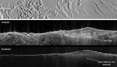 But that would only be good for a single spot on a large planet and the first few decimetres of the surface. To get the global picture of the subsurface they need a radar sounder, such as the Mars Advanced Radar for Subsurface and Ionosphere Sounding (MARSIS), to find the best spots for the future landers to go and dig. MARSIS is built to map the distribution of liquid and solid water in the upper portions of martian crust. If reservoirs of water are detected, it will help us understand the hydrological, geological, climatic and possibly biological evolution of Mars. The radar experiment works because every time a radar wave crosses a boundary between different substances, it generates an echo that the orbiter detects. A successful experiment MARSIS was an experiment in every sense of the word. "It was a leap into the unknown," says Ali Safaeinili, MARSIS co-investigator at the Jet Propulsion Laboratory (JPL). No one had ever used a radar sounder from orbit on another planet before. So the team could not even be sure whether it would work as planned. The subsurface of the planet might have been too opaque to the radar waves or the upper levels of martian atmosphere (ionosphere) might have distorted the signal too much to be useful. Thankfully, none of this happened. "We have demonstrated that the polar caps at Mars are mostly water ice, and produced an inventory so now we know exactly how much water there is," says Roberto Orosei, MARSIS Deputy Principal Investigator, IASF-INAF, Italy. While MARSIS is still collecting data, a follow-up instrument is already operating at Mars. The Shallow Subsurface Radar (SHARAD) on NASA's Mars Reconnaissance Orbiter works at higher frequencies than MARSIS and can see more details in the signals it receives from the underground layers, at the cost of shallower penetration. Elsewhere in the Solar System... Armed with a better understanding of how planetary radar sounders work, the MARSIS team is beginning to look further afield in the Solar System, to other bodies that might benefit from radar investigation. One obvious target is Jupiter's icy moon, Europa. A MARSIS-type experiment in orbit around Europa could probe its icy crust to help understand the puzzling features we see on the surface. It may even see the interface at the bottom of the ice where an ocean is expected to begin. "At the south pole of Mars, we are seeing through ice 3.7 km thick. A small calculation shows that we could see through ice down to 20 km or more thick at Mars," says Safaeinili. At Saturn's moon, Titan, penetrating radar could be used to measure the depths of the hydrocarbon lakes that the Cassini spacecraft has detected. It could also probe the structure beneath the enigmatic geysers that Cassini has observed on another one of Saturn's satellites, Enceladus. "Radar sounders are very well suited to exploring icy worlds," says Orosei. But not just for icy moons. Asteroids and comets could be thoroughly scanned by a radar sounder, producing three-dimensional maps of their interior perhaps exactly the data we will need if, one day, we have to nudge one out of Earth's way. MARSIS has served as an excellent example of international collaboration between Europe and America. Increasingly, such collaborations are set to become a positive feature of our joint exploration of space. Likewise, radar sounding will become an essential component of future planetary missions. In the near term, planetary scientists can look forward to more results from MARSIS. "The analysis is not concluded yet," says Orosei. In fact, while MARSIS is still collecting data, everyone concerned expects more surprises. Mars Express has been orbiting the red planet since December 2003. It carries seven scientific experiments, including MARSIS. The primary purpose of MARSIS is to investigate the subsurface of Mars up to a depth of 5 km in order to detect buried materials, such as water ice or liquid. It is the first instrument ever designed to actually look below the surface of Mars. MARSIS was developed jointly by the Italian Space Agency and NASA, under the scientific supervision of the University of Rome 'La Sapienza', in partnership with JPL and the University of Iowa, USA. The Shallow Subsurface Radar on NASA's Mars Reconnaissance Orbiter was provided by the Italian Space Agency (ASI). Its operations are led by the University of Rome and its data is analysed by a joint U.S.-Italian science team. |