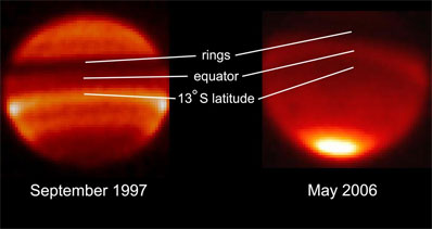 The Cassini infrared results, which appear in the same issue of Nature as the data from the 22-year ground-based observing campaign, indicate that Saturn's wave pattern is similar to a pattern found in Earth's upper atmosphere. The earthly oscillation takes about two years. A similar pattern on Jupiter takes more than four Earth years. The new Saturn findings add a common link to the three planets. Just as scientists have been studying climate changes in Earth's atmosphere for long periods of time, NASA scientists have been studying changes in Saturn's atmosphere. Glenn Orton of NASA's Jet Propulsion Laboratory in Pasadena, Calif., says patience is the key to studying changes over the course of a Saturnian year, the equivalent of about 30 Earth years. "You could only make this discovery by observing Saturn over a long period of time," said Orton, lead author of the ground-based study. "It's like putting together 22 years worth of puzzle pieces, collected by a hugely rewarding collaboration of students and scientists from around the world on various telescopes." The wave pattern is called an atmospheric oscillation. It ripples back and forth within Saturn's upper atmosphere. In this region, temperatures switch from one altitude to the next in a candy cane-like, striped, hot-cold pattern. These varying temperatures force the wind in the region to keep changing direction from east to west, jumping back and forth. As a result, the entire region oscillates like a wave. A "snapshot" of the hot-cold temperature patterns in Saturn's atmosphere was captured by the Cassini Composite Infrared Spectrometer. Along with Earth-based data, the "snapshot" also uncovered other interesting phenomena. Among them: the temperature at Saturn's equator switches from hot to cold, and temperatures on either side of the equator switch from cold to hot every Saturn half-year. Mike Flasar, co-author of the Cassini paper, and principal investigator for Cassini's Composite Infrared Spectrometer at NASA's Goddard Space Flight Center, Greenbelt, Md., said that Cassini helped define this oscillation in combination with the ground observation campaign. "It's this great synergy of using ground-based data over time, and then getting up close and personal with the oscillation in Saturn's atmosphere through Cassini," said Flasar. "Without Cassini, we might never have seen the structure of the oscillation in detail." Cassini scientists hope to find out why this phenomenon on Saturn changes with the seasons, and why the temperature switchover happens when the sun is directly over Saturn's equator. The Cassini-Huygens mission is a cooperative project of NASA, the European Space Agency and the Italian Space Agency. JPL, a division of the California Institute of Technology in Pasadena, manages the Cassini mission for NASA's Science Mission Directorate, Washington, D.C. The Cassini orbiter was designed, developed and assembled at JPL. The Composite Infrared Spectrometer team is based at NASA's Goddard Space Flight Center, Greenbelt, Md. |
