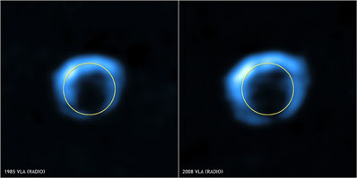 Twenty-two years later, Chandra observations revealed the remnant had expanded by a surprisingly large amount, about 16 percent, since 1985. This indicates the supernova remnant is much younger than previously thought. That young age was confirmed in recent weeks when the Very Large Array made new radio observations. This comparison of data pinpoints the age of the remnant at 140 years - possibly less if it has been slowing down - making it the youngest on record in the Milky Way. Besides being the record holder for youngest supernova, the object is of considerable interest for other reasons. The high expansion velocities and extreme particle energies that have been generated are unprecedented and should stimulate deeper studies of the object with Chandra and the Very Large Array. "No other object in the galaxy has properties like this," Reynolds said. "This find is extremely important for learning more about how some stars explode and what happens in the aftermath." These results are scheduled to appear in The Astrophysical Journal Letters. NASA's Marshall Space Flight Center in Huntsville, Ala., manages the Chandra program for NASA's Science Mission Directorate in Washington. The Smithsonian Astrophysical Observatory controls Chandra's science and flight operations from the Chandra X-ray Center in Cambridge, Mass. |