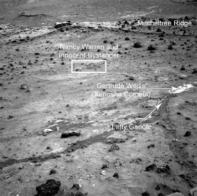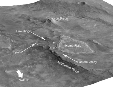 The Tyrone soil proved rich in sulfate minerals, a phenomenon seen by Spirit at other locations in the Columbia Hills, where Spirit has been exploring since late 2004. While sulfates can form in several ways, water is involved in most. "While parked next to Tyrone, we used the Mini-TES to look at some nearby light-toned and knobby outcrops," says Ruff. Ruff is the geologist in charge of day-to-day operations for Mini-TES, which was designed by ASU's Philip Christensen, a Regents' Professor of Geological Sciences and director of the Mars Space Flight Facility. Each rover is outfitted with a Mini-TES. Silica surprise Ruff continues, "It wasn't clear what we were seeing in the knobby outcrops because they were contaminated with dust and wind-blown soil. But I thought they might be silica-rich." Additional surveys with Mini-TES identified other outcrops, similarly contaminated but likewise hinting at silica. As it happened, the rover's jammed right front wheel inadvertently produced the "Aha!" moment. Ruff and others on the science team noticed that the stuck wheel had gouged a trench a few inches deep through the soil as the rover drove ahead in reverse, dragging the crippled wheel behind. "The trench looked bright white," Ruff recalls, "but we thought initially it was just more sulfate minerals." While parked nearby, however, Ruff got curious. "We aimed Mini-TES at the trench and it showed a clear silica spectrum. This prompted us to drive back to it, where the rover's Alpha Particle X-Ray Spectrometer told us the white soil was more than 90 percent silica. That's a record high for silica on Mars." Fumaroles and hot springs Making such pure silica requires a lot of water, says Ruff. "On Earth, the only way to have this kind of silica enrichment is by hot water reacting with rocks." This, Ruff says, links the silica with Home Plate, which the rover team already knew was a volcanic feature. "Home Plate came from an explosive volcanic event with water or ice being involved," he explains. "We saw where rocks were thrown into the air and landed to make small indentations in the soft, wet ash sediment around the vent."
