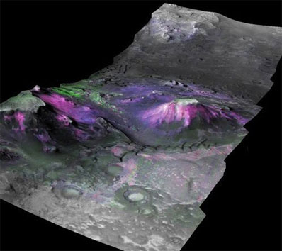 One study, published in the July 17 issue of Nature, shows that vast regions of the ancient highlands of Mars‹which cover about half the planet‹contain clay minerals, which can form only in the presence of water. Volcanic lavas buried the clay-rich regions during subsequent, drier periods of the planet's history, but impact craters later exposed them at thousands of locations across the planet. The clay-like minerals, called phyllosilicates, preserve a record of the interaction of water with rocks dating back to what is called the Noachian period of Mars' history, about 4.6 to 3.8 billion years ago. This period corresponds to the earliest years of the solar system, when Earth, the moon and Mars sustained a cosmic bombardment by comets and asteroids. Rocks of this age have largely been destroyed on Earth by plate tectonics; they are preserved on the moon, but were never exposed to liquid water. The phyllosilicate-containing rocks on Mars therefore preserve a unique record of liquid water environments‹possibly suitable for life‹in the early solar system. "The minerals present in Mars' ancient crust show a variety of wet environments," says John Mustard, a member of the CRISM team from Brown University in Providence, R.I., and lead author of the Nature study. "In most locations the rocks are lightly altered by liquid water, but in a few locations they have been so altered that a great deal of water must have flushed though the rocks and soil. This is really exciting because we're finding dozens of sites where future missions can land to understand if Mars was ever habitable and if so, to look for signs of past life."