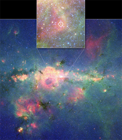 The reigning "brightest star" champion is Eta Carina, with a whopping solar wattage of 4.7 million suns. But according to astronomers, it's hard to pin down an exact brightness, or luminosity, for these scorching stars, so they could potentially shine with a similar amount of light. "The Peony nebula star is a fascinating creature. It appears to be the second-brightest star that we now know of in the galaxy, and it's located deep into the galaxy's center," said Lidia Oskinova of Potsdam University in Germany. "There are probably other stars just as bright if not brighter in our galaxy that remain hidden from view." Oskinova is principal investigator for the research and second author of a paper appearing in a future issue of the journal Astronomy and Astrophysics. Scientists already knew about the Peony nebula star, but because of its sheltered location in the dusty central hub of our galaxy, its extreme luminosity was not revealed until now. Spitzer's dust-piercing infrared eyes can see straight into the heart of our galaxy, into regions impenetrable by visible light. Likewise, infrared data from the European Southern Observatory's New Technology Telescope in Chile were integral in calculating the Peony nebula star's luminosity. "Infrared astronomy opens extraordinary views into the environment of the central region of our galaxy," said Oskinova. The brightest stars in the universe are also the biggest. Astronomers estimate the Peony nebula star kicked off its life with a hefty mass of roughly 150 to 200 times that of our sun. Stars this massive are rare and puzzle astronomers because they push the limits required for stars to form. Theory predicts that if a star starts out too massive, it can't hold itself together and must break into a double or multiple stars instead. Not only is the Peony nebula star hefty, it also has a wide girth. It is a type of giant blue star called a Wolf-Rayet star, with a diameter roughly 100 times that of our sun. That means this star, if placed where our sun is, would extend out to about the orbit of Mercury. With so much mass, the star barely keeps itself together. It sheds an enormous amount of stellar matter in the form of strong winds over its relatively short lifetime of a few million years. This matter is pushed so hard by strong radiation from the star that the winds speed up to about 1.6 million kilometers per hour (one million miles per hour) in only a few hours. Ultimately, the Peony nebula star will blow up in a fantastic explosion of cosmic proportions called a supernova. In fact, Oskinova and her colleagues say that the star is ripe for exploding soon, which in astronomical terms mean anytime from now to millions of years from now. "When this star blows up, it will evaporate any planets orbiting stars in the vicinity," said Oskinova. "Farther out from the star, the explosion could actually trigger the birth of new stars." In addition to the star itself, the astronomers noted a cloud of dust and gas, called a nebula, surrounding the star. The team nicknamed this cloud the Peony nebula because it resembles the ornate flower. "The nebula was probably created from the spray of dust leaking off the massive Peony nebula star," said Andreas Barniske of Potsdam University, lead author of the study. Wolf-Rainer Hamann, also of Potsdam University, is another co-author of the paper and the principal investigator of a Spitzer program enabling this research. NASA's Jet Propulsion Laboratory, Pasadena, Calif., manages the Spitzer Space Telescope mission for NASA's Science Mission Directorate, Washington. Science operations are conducted at the Spitzer Science Center at the California Institute of Technology, also in Pasadena. Caltech manages JPL for NASA. Spitzer's infrared spectrograph, which was used to determine the luminosity of the Peony nebula star, was built by Cornell University, Ithaca, N.Y. Its development was led by Jim Houck of Cornell. |