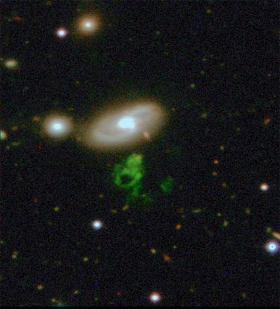 van Arkel came across the image of a strange, gaseous object with a hole in the center while using the www.galaxyzoo.org website to classify images of galaxies. When she posted about the image that quickly became known as "Hanny's Voorwerp" ( Dutch for "object") on the Galaxy Zoo forum, astronomers who run the site began to investigate and soon realized van Arkel might have found a new class of astronomical object. "At first, we had no idea what it was. It could have been in our solar system, or at the edge of the universe," said Schawinski, a member and co-founder of the Galaxy Zoo team. Scientists working at telescopes around the world and with satellites in space were asked to take a look at the mysterious Voorwerp. "What we saw was really a mystery," said Schawinski. "The Voorwerp didn't contain any stars." Rather, it was made entirely of gas so hot - about 10,000 Celsius - that the astronomers felt it had to be illuminated by something powerful. They will soon use the Hubble Space Telescope to get a closer look. Since there was no obvious source at hand in the Voorwerp itself, the team looked to find the source of illumination around the Voorwerp, and soon turned to the nearby galaxy IC 2497. "We think that in the recent past the galaxy IC 2497 hosted an enormously bright quasar," Schawinski explains. "Because of the vast scale of the galaxy and the Voorwerp, light from that past still lights up the nearby Voorwerp even though the quasar shut down sometime in the past 100,000 years, and the galaxy's black hole itself has gone quiet." "From the point of view of the Voorwerp, the galaxy looks as bright as it would have before the black hole turned off it's this light echo that has been frozen in time for us to observe," said Chris Lintott, a co-organizer of Galaxy Zoo at Oxford University, UK. "It's rather like examining the scene of a crime where, although we can't see them, we know the culprit must be lurking somewhere nearby in the shadows." Similar light echoes have been seen around supernovae that exploded decades or centuries ago. Quasars are very unusual, highly luminous objects, powered by supermassive black holes, and most are extremely distant. "The strange 'Hanny's Voorwerp' looks like it could be the nearest example of a luminous quasar," said C. Megan Urry, Israel Munson Professor of Physics & Astronomy and Chair of the Physics Department at Yale, who was not involved in the research. "IC 2497 is so close that if the quasar was still shining today, on a good night you could probably see it with a small telescope," Schawinski added. "The nearest active quasar, called 3C 273, is 1.7 billion light years further away." "This discovery really shows how citizen science has come of age in the Internet world," commented Professor Bill Keel of the University of Alabama, a galaxyzoo.org team member. "Hanny's attentiveness alerted us not only to a peculiar object, but to a window into the cosmic past which might have eluded us for a long time otherwise. Trying to understand the processes operating here has proven to be a fascinating challenge, involving a whole range of astrophysical techniques and instruments around the world and beyond. This has also been some of the most rewarding astronomy I've done in years!" The Galaxy Zoo project was imagined and begun by Schawinski and his colleague Chris Lintott at Oxford. While working on his PhD thesis, Schawinski classified and catalogued nearly 50,000 galaxies. Knowing that the human eye is sometimes more sensitive than a computer at picking out unusual patterns, he mused that it would be wonderful if there were amateur astronomers who were interested in doing some of the "scanning." "When we launched Galaxy Zoo we were overwhelmed - as was the internet portal, initially - with the outpouring of public interest and volunteer input," said Schawinski. During the last year, over 150,000 armchair astronomers from all over the world volunteered their time and submitted over 50 million classifications for a set of one million images online. They then could follow the progress of the science they made possible at www.galaxyzooblog.org "It's amazing to think that this object has been sitting in the archives for decades and that amateur volunteers can help by spotting things like this online," said Hanny van Arkel. "It was a fantastic present to find out on my 25th birthday that we will get observational time on the Hubble Space Telescope to follow-up this discovery." The next stage of Galaxy Zoo will ask volunteers to search for more unusual astronomical objects. But, "Hanny's Voorwerp" remains a mystery. It's huge central hole is over 16,000 thousand light years across and Galaxy Zoo astronomers are still puzzling over what caused it. Besides Schawinski, the Galaxy Zoo team includes scientists from the University of Oxford, the University of Portsmouth and Johns Hopkins University (USA), and Fingerprint Digital Media of Belfast. Key contributors to this stage of the project were Chris Lintott from the University of Oxford, Bill Keel from the University of Alabama (USA), Dan Smith (Liverpool John Moores University) Matt Jarvis (University of Hertfordshire) and Nicola Bennert (University of California Riverside, USA). The team's observations and analysis are included in a paper which has been submitted to the Monthly Notices of the Royal Astronomical Society, the UK's leading astronomical journal. |
