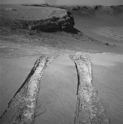 Opportunity used its own entry tracks from nearly a year ago as the path for a drive of 6.8 meters (22 feet) bringing the rover out over the top of the inner slope and through a sand ripple at the lip of Victoria Crater. The exit drive, conducted late Thursday, completed a series of drives covering 50 meters (164 feet) since the rover team decided about a month ago that it had completed its scientific investigations inside the crater.