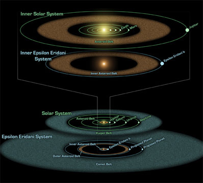 Epsilon Eridani and its planetary system show remarkable similarities to our solar system at a comparable age. "Studying Epsilon Eridani is like having a time machine to look at our solar system when it was young," said Smithsonian astronomer Massimo Marengo (Harvard-Smithsonian Center for Astrophysics). Marengo is a co-author of the discovery paper, which will appear in the Jan. 10 issue of The Astrophysical Journal. Lead author Dana Backman (SETI Institute) agreed, saying, "This system probably looks a lot like ours did when life first took root on Earth." Our solar system has a rocky asteroid belt between Mars and Jupiter, about 3 astronomical units from the Sun. (An astronomical unit equals the average Earth-Sun distance of 93 million miles.) In total, it contains about 1/20 the mass of Earth's Moon. Using NASA's Spitzer Space Telescope, the team of astronomers found an identical asteroid belt orbiting Epsilon Eridani at a similar distance of 3 astronomical units. They also discovered a second asteroid belt 20 astronomical units from Epsilon Eridani (about where Uranus is located in our solar system). The second asteroid belt contains about as much mass as Earth's Moon. A third, icy ring of material seen previously extends about 35 to 100 astronomical units from Epsilon Eridani. A similar icy reservoir in our solar system is called the Kuiper Belt. However, Epsilon Eridani's outer ring holds about 100 times more material than ours.