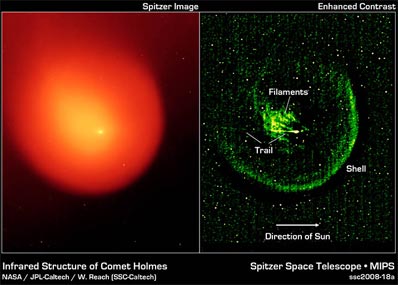 NASA's Spitzer gets sneak peak inside comet Holmes NASA/JPL NEWS RELEASE Posted: November 3, 2008 When comet Holmes unexpectedly erupted in 2007, professional and amateur astronomers around the world turned their telescopes toward the spectacular event. Their quest was to find out why the comet had suddenly exploded.