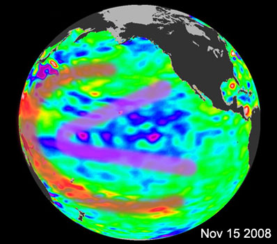Oscillation rules as the Pacific Ocean cools NASA/JPL NEWS RELEASE Posted: December 14, 2008 PASADENA, Calif. -- The latest image of sea-surface height measurements from the U.S./French Jason-1 oceanography satellite shows the Pacific Ocean remains locked in a strong, cool phase of the Pacific Decadal Oscillation, a large, long-lived pattern of climate variability in the Pacific associated with a general cooling of Pacific waters. The image also confirms that El Nino and La Nina remain absent from the tropical Pacific.