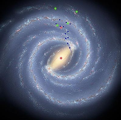 Our Solar System is about 28,000 light-years from the Milky Way's center. At that distance, the new observations indicate, we're moving at about 600,000 miles per hour in our Galactic orbit, up from the previous estimate of 500,000 miles per hour. The scientists are using the National Science Foundation's Very Long Baseline Array (VLBA) radio telescope to remake the map of the Milky Way. Taking advantage of the VLBA's unparalleled ability to make extremely detailed images, the team is conducting a long-term program to measure distances and motions in our Galaxy. They reported their results at the American Astronomical Society's meeting in Long Beach, California. The scientists observed regions of prolific star formation across the Galaxy. In areas within these regions, gas molecules are strengthening naturally-occuring radio emission in the same way that lasers strengthen light beams. These areas, called cosmic masers, serve as bright landmarks for the sharp radio vision of the VLBA. By observing these regions repeatedly at times when the Earth is at opposite sides of its orbit around the Sun, the astronomers can measure the slight apparent shift of the object's position against the background of more-distant objects. "The new VLBA observations of the Milky Way are producing highly-accurate direct measurements of distances and motions," said Karl Menten of the Max Planck Institute for Radio Astronomy in Germany, a member of the team. "These measurements use the traditional surveyor's method of triangulation and do not depend on any assumptions based on other properties, such as brightness, unlike earlier studies." The astronomers found that their direct distance measurements differed from earlier, indirect measurements, sometimes by as much as a factor of two. The star-forming regions harboring the cosmic masers "define the spiral arms of the Galaxy," Reid explained. Measuring the distances to these regions thus provides a yardstick for mapping the Galaxy's spiral structure. "These direct measurements are revising our understanding of the structure and motions of our Galaxy," Menten said. "Because we're inside it, it's difficult for us to determine the Milky Way's structure. For other galaxies, we can simply look at them and see their structure, but we can't do this to get an overall image of the Milky Way. We have to deduce its structure by measuring and mapping," he added. The VLBA can fix positions in the sky so accurately that the actual motion of the objects can be detected as they orbit the Milky Way's center. Adding in measurements of motion along the line of sight, determined from shifts in the frequency of the masers' radio emission, the astronomers are able to determine the full 3-dimensional motions of the star-forming regions. Using this information, Reid reported that "most star-forming regions do not follow a circular path as they orbit the Galaxy; instead we find them moving more slowly than other regions and on elliptical, not circular, orbits." The researchers attribute this to what they call spiral density wave shocks, which can take gas in a circular orbit, compress it to form stars, and cause it to go into a new, elliptical orbit. This, they explained, helps to reinforce the spiral structure. Reid and his colleagues found other surprises, too. Measuring the distances to multiple regions in a single spiral arm allowed them to calculate the angle of the arm. "These measurements," Reid said, "indicate that our Galaxy probably has four, not two, spiral arms of gas and dust that are forming stars." Recent surveys by NASA's Spitzer Space Telescope suggest that older stars reside mostly in two spiral arms, raising a question of why the older stars don't appear in all the arms. Answering that question, the astronomers say, will require more measurements and a deeper understanding of how the Galaxy works. The VLBA, a system of 10 radio-telescope antennas stretching from Hawaii to New England and the Caribbean, provides the best ability to see the finest detail, called resolving power, of any astronomical tool in the world. The VLBA can routinely produce images hundreds of times more detailed than those produced by the Hubble Space Telescope. The VLBA's tremendous resolving power, equal to being able to read a newspaper in Los Angeles from the distance of New York, is what permits the astronomers to make precise distance determinations. The National Radio Astronomy Observatory is a facility of the National Science Foundation, operated under cooperative agreement by Associated Universities, Inc. Headquartered in Cambridge, Mass., the Harvard-Smithsonian Center for Astrophysics (CfA) is a joint collaboration between the Smithsonian Astrophysical Observatory and the Harvard College Observatory. CfA scientists, organized into six research divisions, study the origin, evolution and ultimate fate of the universe. |