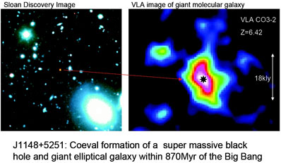 Earlier studies of galaxies and their central black holes in the nearby Universe revealed an intriguing linkage between the masses of the black holes and of the central "bulges" of stars and gas in the galaxies. The ratio of the black hole and the bulge mass is nearly the same for a wide range of galactic sizes and ages. For central black holes from a few million to many billions of times the mass of our Sun, the black hole's mass is about one one-thousandth of the mass of the surrounding galactic bulge. "This constant ratio indicates that the black hole and the bulge affect each others' growth in some sort of interactive relationship," said Dominik Riechers, of Caltech. "The big question has been whether one grows before the other or if they grow together, maintaining their mass ratio throughout the entire process." In the past few years, scientists have used the National Science Foundation's Very Large Array radio telescope and the Plateau de Bure Interferometer in France to peer far back in the 13.7 billion-year history of the Universe, to the dawn of the first galaxies. "We finally have been able to measure black-hole and bulge masses in several galaxies seen as they were in the first billion years after the Big Bang, and the evidence suggests that the constant ratio seen nearby may not hold in the early Universe. The black holes in these young galaxies are much more massive compared to the bulges than those seen in the nearby Universe," said Fabian Walter of the Max-Planck Institute for Radioastronomy (MPIfR) in Germany. "The implication is that the black holes started growing first." The next challenge is to figure out how the black hole and the bulge affect each others' growth. "We don't know what mechanism is at work here, and why, at some point in the process, the 'standard' ratio between the masses is established," Riechers said. New telescopes now under construction will be key tools for unraveling this mystery, Carilli explained. "The Expanded Very Large Array (EVLA) and the Atacama Large Millimeter/submillimeter Array (ALMA) will give us dramatic improvements in sensitivity and the resolving power to image the gas in these galaxies on the small scales required to make detailed studies of their dynamics," he said. "To understand how the Universe got to be the way it is today, we must understand how the first stars and galaxies were formed when the Universe was young. With the new observatories we'll have in the next few years, we'll have the opportunity to learn important details from the era when the Universe was only a toddler compared to today's adult," Carilli said. Carilli, Riechers and Walter worked with Frank Bertoldi of Bonn University; Karl Menten of MPIfR; and Pierre Cox and Roberto Neri of the Insitute for Millimeter Radio Astronomy (IRAM) in France. The National Radio Astronomy Observatory is a facility of the National Science Foundation, operated under cooperative agreement by Associated Universities, Inc. |