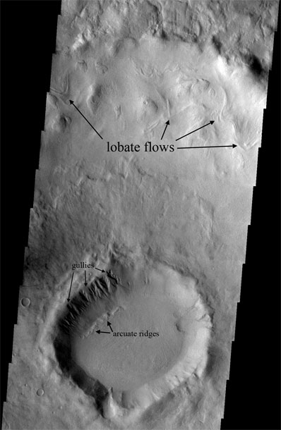 Berman, along with PSI Senior Scientist David Crown and PSI Research Scientist Leslie Bleamaster III, surveyed the geologic features in two sets of mid-latitude craters. Each set included about 100 craters, with the first set in the Arabia Terra region of the northern hemisphere and the second set in an area east of Hellas basin in the southern hemisphere. The researchers selected craters that are greater than 20 km (about 12.5 miles) in diameter that have been completely or nearly completely photographed by cameras on various spacecraft, including the Mars Odyssey THEMIS VIS camera, the Mars Global Surveyor Mars Orbiter Camera, and the Viking Orbiter cameras. They looked specifically for the following erosional or depositional features, the number and sizes of those features, and how the features are oriented (i.e., whether they face the equator or the planet's pole in their hemisphere): -- Lobate flows - Lobe-shaped flow features that have pitted surfaces and raised ridges on their lateral margins are observed on the walls of some craters. These lobes resemble rock glaciers on Earth. -- Channels - Narrow channels often breach crater walls and extend outside the craters, as well as across crater floors, These channels may have been formed by flowing water. -- Crater-wall valleys - Trough-like crater-wall valleys, wider than the above-mentioned channels, typically start at the top of the crater rim and terminate where the wall meets the floor. These valleys are sometimes filled with rough-textured deposits, which may be glacial. -- Gullies and alcoves - Gullies are typically composed of three parts: alcoves at the head of a channel, channels, and debris fans, and are thought to have been formed by flowing water. -- Arcuate ridges - These are small, arc-shaped ridges that enclose depressions at the base of crater walls, often below gullies. Berman interprets these to be glacial moraines, remnants of glacial deposits that have since evaporated. -- Debris aprons - These aprons are pitted and lineated deposits on crater floors. They are similar to debris-covered glaciers or ice-rich landslides seen on Earth. All of these features suggest a landscape shaped by liquid water and/or ice, Berman said. He found that lobate flows, gullies, and arcuate ridges on the crater walls between latitudes of 30 to 45 degrees face the pole in their hemisphere, whereas equator-facing orientations are more common than pole-facing ones at latitudes between 45 and 60 degrees. In the southern study area, narrow channels generally had pole-facing orientations, whereas wider valleys generally have equator-facing orientations. The features' pole-facing or equator-facing orientations could result from uneven heating of the crater walls. Ice on walls that get more sunlight would melt faster, causing more water to flow and form the gullies and other features. Unlike Earth, whose axis only oscillates through an arc of about four degrees over millions of years, Mars appears to have an axis that tilts between vertical and as much as 60 degrees, according to recent studies. Such tilting could enhance ice deposition, Berman said. When one pole begins leaning toward the sun, ice evaporates and then falls as snow at the other pole, which is getting little sunlight. Such tilting could have caused ice sheets to form in areas that are now ice-free, he added. Further evidence for flowing ice is found on the crater floors, Berman observed. He found that the floors of small craters slope away from the walls that exhibit erosional/depositional features toward the more pristine ones. These slopes have inclines of about 0.5 to 3 degrees. This suggests that ice-rich materials flowed from one crater wall to the other. Tilting floors are less evident in larger craters, although some have gradually sloping floors where debris apron material is evident. The PSI team's crater study has led them to make the following conclusions: -- The orientation of erosional/depositional features (whether they face the equator or the pole) suggests a direct relationship to total solar heating along the crater walls. -- Differences in the shape and size of various erosional/depositional features can be explained by differences in crater-wall slopes, local topography and orientation. -- The geologic features and suites of features found in the craters may have been created by multiple cycles of ice-sheet formation in response to changes in the tilt of Mars' rotation axis. This work was funded by a grant to PSI from NASA's Mars Data Analysis Program (PI David Crown). |