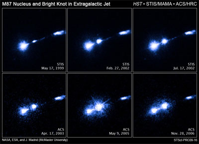 Madrid assembled seven years' worth of Hubble archival images of the jet to capture changes in the HST-1's behavior over time. Hubble's view of the event. Some of the images came from observing programs that studied the galaxy, but not the jet. He found data from the Space Telescope Imaging Spectrograph (STIS) that showed a noticeable brightening between 1999 and 2001. In images from 2002 to 2005, HST-1 continued to rise steadily in brightness. In 2003 the jet knot was more brilliant than M87's luminous core. In May 2005 HST-1 became 90 times brighter than it was in 1999. After May 2005 the flare began to fade, but it intensified again in November 2006. This second outburst was fainter than the first one. "By watching the outburst over several years, I was able to follow the brightness and see the evolution of the flare over time," Madrid says. "We are lucky to have telescopes like Hubble and Chandra, because without them we would see the increase in brightness in the core of M87, but we would not know where it was coming from." Madrid hopes that future observations of HST-1 will reveal the cause of the mysterious activity. "We hope the observations will yield some theories that will give us some good explanations as to the mechanism that is causing the flaring," Madrid says. "Astronomers would like to know if this is an intrinsic instability of the jet when it plows its way out of the galaxy, or if it is something else." The study's results are published in the April 2009 issue of The Astronomical Journal. The Hubble Space Telescope is a project of international cooperation between NASA and the European Space Agency (ESA) and is managed by NASA's Goddard Space Flight Center (GSFC) in Greenbelt, Md. The Space Telescope Science Institute (STScI) conducts Hubble science operations. The institute is operated for NASA by the Association of Universities for Research in Astronomy, Inc., Washington, D.C. STScI is an International Year of Astronomy 2009 (IYA 2009) program partner. |