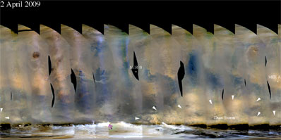 Unexplained computer reboots by Spirit in the past week are not related to dust's effects on the rover's power supply, but the dust-storm season remains a concern. Spirit received commands Tuesday to transmit more engineering data in coming days to aid in diagnosis of the reboots. After months of relatively clear air, increased haze in March reduced Spirit's daily energy supply by about 20 percent and Opportunity's by about 30 percent. Widespread haze resulted from a regional storm that made skies far south of the rovers very dusty. Conditions at the rovers' sites remained much milder than the worst they have endured. In July 2007, nearly one Martian year ago, airborne dust blocked more than 99 percent of the direct sunlight at each rover's site. The rovers point cameras toward the sun to check the clarity of the atmosphere virtually every day. These measurements let the planning team estimate how much energy the rovers will have available on the following day. Observations of changes in the Martian atmosphere by NASA's Mars Reconnaissance Orbiter, which reached Mars in 2006, and NASA's Mars Odyssey, which reached Mars in 2001, are available to supplement the rover's own skywatch. The Mars Color Imager camera on Mars Reconnaissance Orbiter sees the entire planet every day at resolution comparable to weather satellites around Earth. "We can identify where dust is rising into the atmosphere and where it is moving from day to day," said Michael Malin of Malin Space Science Systems, San Diego, principal investigator for Mars Color Imager. "Our historical baseline of observing Martian weather, including data from the Mars Global Surveyor mission from 1998 to 2007, helps us know what to expect. Weather on Mars is more repetitive from year to year than weather on Earth. Global dust events do not occur every Mars year, but if they do occur, they are at this time of year." Two other instruments -- the Thermal Emission Imaging System on Mars Odyssey and the Mars Climate Sounder on Mars Reconnaissance Orbiter -- monitor changes in airborne dust or dust-related temperatures in Mars' upper atmosphere. Orbiters also aid surface missions with radio relays, imaging to aid drive plans, and studies of possible future landing sites. When orbital observations indicate a dust-raising storm is approaching a rover, the rover team can take steps to conserve energy. For example, the team can reduce the length of time the rover will be active or can shorten or delete some communication events. In recent weeks, frequent weather reports from Bruce Cantor of Malin's Mars Color Imager team let the rover team know that the March increase in haziness was not the front edge of a bad storm. "Bruce's weather reports have let us be more aggressive about using the rovers," said Mark Lemmon, a rover-team atmospheric scientist at Texas A&M University, College Station. "There have been fewer false alarms. Earlier in the mission, we backed off a lot on operations whenever we saw a small increase in dust. Now, we have enough information to know whether there's really a significant dust storm headed our way." At other times, the weather reports prompt quick precautionary actions. On Saturday, Nov. 8, 2008, the rover team received word from Cantor of a dust storm nearing Spirit. The team deleted a communication session that Sunday and sent a minimal-activity set of commands that Monday. Without those responses, Spirit would likely have depleted its batteries to a dangerous level. Winds that can lift dust into the air can also blow dust off the rovers' solar panels. The five-year-old rover missions, originally planned to last for three months, would have ended long ago if beneficial winds didn't occasionally remove some of the dust that accumulates on the panels. A cleaning event in early April aided Opportunity's power output, and Spirit got two minor cleanings in February, but the last major cleaning for Spirit was nearly a full Martian year ago. Nelson said, "We're all hoping we'll get another good cleaning." JPL, a division of the California Institute of Technology, Pasadena, manages the Mars Exploration Rovers, Mars Odyssey and Mars Reconnaissance Orbiter for NASAšs Science Mission Directorate, Washington. |