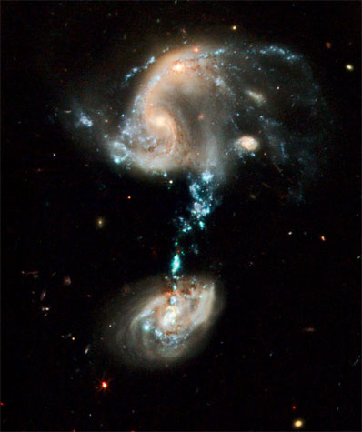 However, the most striking feature of this galaxy troupe is the impressive blue stream of material extending from the northern component. This "fountain" contains complexes of super star clusters, each one of which may contain dozens of individual young star clusters. The blue color is produced by the hot, massive stars which dominate the light in each cluster. Overall, the "fountain" contains many millions of stars. These young star clusters probably formed as a result of the interactions between the galaxies in the northern component of Arp 194. The compression of gas involved in galaxy interactions can enhance the star-formation rate and give rise to brilliant bursts of star formation in merging systems. Hubble's resolution shows clearly that the stream of material lies in front of the southern component of Arp 194, as evidenced by the dust that is silhouetted around the star-cluster complexes. It is therefore not entirely clear whether the southern component actually interacts with the northern pair. The details of the interactions among the multiple galaxies that make up Arp 194 are complex. The shapes of all the galaxies involved appear to have been distorted, possibly by their gravitational interactions with one another. Arp 194, located in the constellation Cepheus, resides approximately 600 million light-years away from Earth. It contains some of the many interacting and merging galaxies known in our relatively nearby universe. These observations were taken in January of 2009 with the Wide Field Planetary Camera 2. Images taken through blue, green, and red filters were combined to form this picturesque image of galaxy interaction. The Hubble Space Telescope is a project of international cooperation between NASA and the European Space Agency (ESA) and is managed by NASA's Goddard Space Flight Center (GSFC) in Greenbelt, Md. The Space Telescope Science Institute (STScI) conducts Hubble science operations. The institute is operated for NASA by the Association of Universities for Research in Astronomy, Inc., Washington, D.C. |