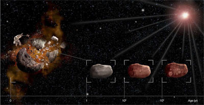 Solar wind tans young asteroids, study reveals EUROPEAN SOUTHERN OBSERVATORY NEWS RELEASE Posted: April 28, 2009 A new study published in Nature reveals that asteroid surfaces age and redden much faster than previously thought -- in less than a million years, the blink of an eye for an asteroid. This study has finally confirmed that the solar wind is the most likely cause of very rapid space weathering in asteroids. This fundamental result will help astronomers relate the appearance of an asteroid to its actual history and identify any after effects of a catastrophic impact with another asteroid.