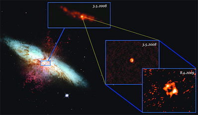 Sky surveys like the one just launched by the Allen Telescope Array, which will look for bright but short-lived radio bursts from supernovas, will provide better estimates of the rate of star formation in nearby galaxies, Bower said. Radio emissions from supernovas also can help astronomers understand how stars explode and what happens before their cores collapse, since radio emissions are caused when debris from the explosion collides with the stellar wind previously shed by the stars. Bower's colleagues are Andreas Bunthaler, Karl M. Menten and Christian Henkel of the Max Planck Institute for Radioastronomy in Bonn, Germany; Mark J. Reid of Harvard University's Center for Astrophysics; and Heino Falcke of the University of Nijmegen in the Netherlands. The radio supernova was discovered on April 8 in M82, a small irregular galaxy located nearly 12 million light years from Earth in the M81 galaxy group, by the Very Large Array, a New Mexico facility operated by the National Radio Astronomy Observatory (NRAO). It was subsequently confirmed by NRAO's Very Long Baseline Array (VLBA), a 10-telescope array whose baseline stretches from Hawaii to the Virgin Islands, providing the sharpest vision of any telescope on Earth. The Allen Telescope Array, comprising 42 of a planned 350 radio dishes and supported by UC Berkeley and the SETI Institute of Mountain View, Calif., last week began a major survey of the radio sky that should turn up many more such radio supernovas, Bower said. While the VLA and VLBA have very narrow fields of view unsuited to all-sky surveys, the ATA's wide-angle view is ideal for scanning the full sky once a day, which is necessary to find sources that brighten and dim over several days. "The ATA can detect objects at least 10 times fainter than this radio supernova, which pushes our survey an order of magnitude deeper than other radio surveys with more attention to transient and variable sources. Radio supernovas are a really strong aspect of that survey," he said. "This ( new radio supernova) is the kind of discovery that we would like to make with the Allen Telescope Array." The ATA will compile an updated catalog of radio sources much as the Sloan Digital Sky Survey updated the older Palomar Observatory Sky Survey of visible and infrared objects. At the same time, it will look for radio signals indicative of intelligent life around other stars. Not all supernovas produce radio emissions, Bower said. If the star has not sloughed off much of its envelope before collapsing inward to form a neutron star or black hole - a classic Type II supernova - then few radio emissions are produced from gas collisions. On the other hand, supernovas in very active star-forming regions, like the center of M82, should produce copious radio emissions because of the density of gas and dust in the interstellar medium. That same gas and dust blocks optical, ultraviolet and X-rays, however, making radio surveys one of the few options to find and observe such supernovas. Bower and his colleagues were studying the motion of M82 with the VLBA, which links the VLA and nine other radio telescopes into a very high resolution instrument, when they noticed a very bright radio source - five times brighter than anything else in the galaxy - in the VLA data. The team looked at earlier observations and found the same source, but almost twice as bright, in data taken May 3, 2008. Data from March 24, 2008, showed an even brighter source - 10 times brighter than in April 2009 - while Oct. 29, 2007, data showed no bright radio source. Extrapolating backward in time, the research team estimates that the star exploded sometime in January 2008, apparently near the very center of the galaxy. The team rejected alternative explanations for the dimming radio source, such as a flare created by a star falling into a supermassive black hole. The newly discovered supernova is thus the brightest in radio wavelengths in the past 20 years, Bower said, and is one of only a few dozen radio supernovas observed to date. The team also looked at the complete data from the VLBA and detected a ring structure indicative of a shock wave plunging through the interstellar medium, bolstering its conclusion that it is a supernova. The ring is about 2,000 astronomical units across, consistent with a year-old supernova. (An astronomical unit 93 million miles, the average distance between Earth and the sun.) The research was funded through National Science Foundation support of NRAO. |