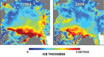 ICESat measurements of the distribution of winter sea ice thickness over the Arctic Ocean in 2004 and 2008. Credit: Ron Kwok, NASA/JPL