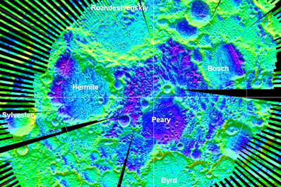 In October, Diviner detected a cold trap in Hermite crater with temperatures of nearly -415 degrees Fahrenheit. "To put that kind of temperature into perspective, nothing like this has ever yet been measured in the solar system," Paige said. "One would have to maybe travel far beyond the Kuiper Belt to find an object with a temperature this low." Hermite is located near the moon's south pole, and surrounding highlands prevent sunlight from ever reaching the deepest reaches of the crater. Diviner measured the temperature at midnight in the middle of winter in the lunar northern hemisphere. Temperatures as low as those in Hermite are cold enough to support water and other volatile compounds for extended periods, according to Paige. |