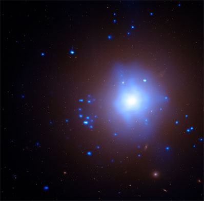 The intensity of the X-ray emission places the source in the "ultraluminous X-ray source" or ULX category, meaning that it is more luminous than any known stellar X-ray source, but less luminous than the bright X-ray sources (active galactic nuclei) associated with supermassive black holes in the nuclei of galaxies. The nature of ULXs is a mystery, but one suggestion is that some ULXs are black holes with masses between about a hundred and several thousand times that of the Sun, a range intermediate between stellar-mass black holes and supermassive black holes located in the nuclei of galaxies. This ULX is in a globular cluster, a very old and crowded conglomeration of stars. Astronomers have suspected that globular clusters could contain intermediate-mass black holes, but conclusive evidence for this has been elusive. "Astronomers have made cases for stars being torn apart by supermassive black holes in the centers of galaxies before, but this is the first good evidence for such an event in a globular cluster," said Jimmy Irwin of the University of Alabama who led the study. Irwin and his colleagues obtained optical spectra of the object using the Magellan I and II telescopes in Las Campanas, Chile. These data reveal emission from gas rich in oxygen and nitrogen but no hydrogen, a rare set of signals from globular clusters. The physical conditions deduced from the spectra suggest that the gas is orbiting a black hole of at least 1,000 solar masses. The abundant amount of oxygen and absence of hydrogen indicate that the destroyed star was a white dwarf, the end phase of a solar-type star that has burned its hydrogen leaving a high concentration of oxygen. The nitrogen seen in the optical spectrum remains an enigma. "We think these unusual signatures can be explained by a white dwarf that strayed too close to a black hole and was torn apart by the extreme tidal forces," said coauthor Joel Bregman of the University of Michigan. Theoretical work suggests that the tidal disruption-induced X-ray emission could stay bright for more than a century, but it should fade with time. So far, the team has observed there has been a 35 percent in X-ray emission from 2000 to 2008. The ULX in this study is located in NGC 1399, an elliptical galaxy about 65 million light years from Earth. Irwin presented these results at the 215th meeting of the American Astronomical Society in Washington, DC. NASA's Marshall Space Flight Center in Huntsville, Ala., manages the Chandra program for NASA's Science Mission Directorate in Washington. The Smithsonian Astrophysical Observatory controls Chandra's science and flight operations from Cambridge, Mass. |
