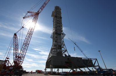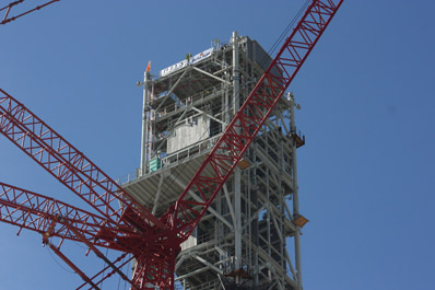 NASA started stacking the launch tower in October and added sections one at a time at the mobile launcher park site just north of the VAB and near the space shuttle's three processing hangars. Hensel Phelps of Orlando, Fla., is overseeing the construction of the mobile launcher. The contract is valued at nearly $264 million, if NASA exercises an option for a second platform and tower. The total cost of the mobile launcher project is estimated at around $500 million, according to NASA. But the ultimate fate of the skyscraping tower is up in the air as the White House appears on the brink of canceling the Ares 1 rocket and scrapping NASA's Constellation program taking aim on the moon. The structure was designed specifically for the Ares 1 but could be modified to support other heavy-lift rockets. A price tag for potential changes to the tower is unknown. A NASA spokesperson said current schedules call for the mobile launcher to be ready to support Ares 1 vehicle processing by January 2014.