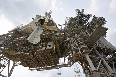 Three 594-foot-tall steel and fiberglass lightning towers were installed around the pad to protect it from electrical surges during thunderstorms. The lightning towers will remain at the pad after the demolition work. The 247-foot-tall fixed service structure was assembled from parts of the Apollo-era mobile launch towers used by the Saturn 5 rocket. NASA added the retractable rotating service structure specifically for the shuttle program. Launch pad 39B was first used by the Saturn 5 rocket on the Apollo 10 mission, a dress rehearsal for the first lunar landing. Saturn 1B rockets launched crews on missions to the Skylab space station in 1973. Three astronauts took off from the pad aboard another Saturn rocket in 1975 on a mission to dock with a Soviet Soyuz spacecraft during a detente in Cold War relations. Perez-Morales said technicians are currently disconnecting the structures from propellant lines in preparation for the dismantling. Workers are also salvaging thousands of copper cables from the pad. The site's tanks for hydrazine and nitrogen tetroxide, the toxic propellants used by the shuttle's manuevering thrusters, will also be decommissioned and destroyed, officials said Massive storage spheres for liquid hydrogen and liquid oxygen will be cleaned and refurbished for use on future rockets, according to Perez-Morales. Officials hope the pad will be ready to support a new rocket program after 2012. "Any new program we expect to still be two years away," Perez-Morales said. "We still have some way to go before the pad is ready."