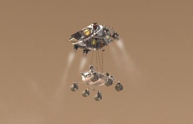 Landing will occur between Aug. 6 and Aug. 20, 2012. NASA officials selected the final launch and landing periods based on the optimum positions of two probes circling Mars. During the dangerous entry and landing phase of the mission, the rover will be sending data back to Earth through the Odyssey orbiter passing overhead. Odyssey will immediately transmit the information back to controllers on Earth using a bent-pipe technique. Passing data through an orbiter will allow scientists on Earth access to much more real-time information than would be possible if the rover was broadcasting directly home. "It is important to capture high-quality telemetry to allow us to learn what happens during the entry, descent and landing, which is arguably the most challenging part of the mission," said Fuk Li, manager of NASA's Mars Exploration Program at at the Jet Propulsion Laboratory. "The trajectory we have selected maximizes the amount of information we will learn to mitigate any problems." But scientists are still deciding the ultimate destination of the Curiosity rover. Matt Golombek, co-chair of the rover's landing site steering committee, said the group plans a series of open workshops and closed meetings during the next year to gauge the opinion of the science community. "It's always going to be a risk-reward trade between science and safety of landing," Golombek told Spaceflight Now. "They're each going to have their pluses and minuses, and NASA will decide where the sweet spot is." Mars Science Laboratory will test out a complex new landing mechanism called a sky crane, which will lower the rover to the Martian surface on a tether from a rocket-powered descent stage. The Pathfinder, Spirit and Opportunity rovers touched down on parachutes and giant airbags that bounced to a stop on Mars. "Airbags are incredibly compliant to all sorts of things," Golombek said. "There are concerns with slopes, but airbags will go to the lowest point around anyway. We haven't found the sky crane any less capable. There's not a huge difference, even though they're obviously dramatically different designs."