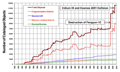 The Bush policy promoted partnerships "that further the peaceful exploration and use of space, as well as to advance national security, homeland security, and foreign policy objectives." But President Obama takes space cooperation a step further, calling for more transparency and collaboration in space debris monitoring and mitigation, preserving space for humanity's future use, and encouraging "responsible actions in, and the peaceful use of, space." "We will expand our work in the United Nations and with other organizations to address the growing problem of orbital debris and to promote 'best practices' for its sustainable use," Secretary of State Hillary Clinton said in a statement. "The United States will also pursue pragmatic transparency and confidence-building measures to mitigate the risk of mishaps, misperceptions, and miscalculations." Space debris is a growing problem for space-faring nations. The issue has been exacerbated by explosions, an accidental 2009 collision between U.S. and Russian spacecraft, and a Chinese military anti-satellite weapons test in 2007 that destroyed a defunct weather satellite. The 2007 anti-satellite test and 2009 collision unleashed more than 250,000 new chunks of debris into orbit at least 1 centimeter, or 0.4 inches, in size, according to the NASA Orbital Debris Program Office. The White House space policy also states the Pentagon and NASA should pursue new technologies to mitigate and remove orbital debris. The Defense Advanced Research Projects Agency, a Pentagon technology development division, is already weighing proposals for debris removal.