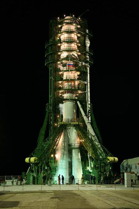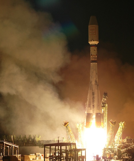 Launching into a partly cloudy night sky, a Soyuz rocket blasts off from the Baikonur Cosmodrome in Kazakhstan at 1710 GMT (1:10 p.m. EDT) Tuesday with six satellites to rejuvenate the orbiting fleet of the Globalstar mobile communications network.