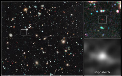 But careful analysis indicates it likely is a collection of hot, young stars, a cluster 100 times smaller than Earth's Milky Way galaxy. Astronomers believe such proto galaxies combined to form the larger, more familiar galaxies seen later in the evolution of the universe. "We've gone back through 96 percent of the life of the universe, to when the universe was only 4 percent of its current age, through 500 million years after the big bang," said Garth Illingworth of the University of California at Santa Cruz. "The team searched through these wonderful data looking for galaxies at these extremely early times. We and others have found galaxies at 650 million years, quite a lot, close to 50 of those galaxies. "We thought that this new camera could teach us more about earlier times so we looked very hard at the data and managed eventually to find an object. This galaxy, 500 million years after the big bang, is extraordinarily faint, a very blue, dynamic object, full of stars forming. Not only did we find an object, we also looked at the data extremely carefully to try and estimate what the total amount of star birth was at that time. "We were astonished to find star birth at 500 million years was dramatically less than it was at 650 million years," he said. "So in a very short period in the life of the universe, star birth had increased by 10 times. Not only did this image tell us about, or show us a glimpse of a galaxy at very early times, but it also told us about how the star birth was increasing in the universe. And that has very important implications." Rachel Somerville, an astronomer at the Space Telescope Science Institute who was not part of the team that made the discovery, said "perhaps the most interesting part of this research is the dog that didn't bark." "Scientifically, it's difficult to learn that much from a single object because we don't know how typical it is," she said. "However, what this showed, which is very important, is that if the properties of galaxies and the population had remained the same as they were just 200 million years later, then they should have found at least 10 times more galaxies. That's a statistically significant result, and that means galaxies as a population were evolving very rapidly over this time period." One of the major questions in astronomy is how long it took the first stars to form in the wake of the big bang and then assemble into galaxies. The Hubble Space Telescope has played a key role in that research, taking what amounts to long time exposures, with increasingly sensitive cameras, to capture light from the early ages of the universe. Hubble's first deep field image was unveiled on Jan. 15, 1996, at a meeting of the American Astronomical Society. Hubble was aimed at an empty region of space in the northern constellation Ursa Major, imaging an area about the size of a grain of rice held at arm's length. The Wide Field and Planetary Camera 2 snapped 342 exposures over 10 days between Dec. 18 and 28, 1995. The image was a bit of a gamble given the high value of observing time on Hubble and the lack of any certainty about what the telescope might find. But the gamble paid off. The resulting image -- the original Hubble Deep Field -- astonished astronomers and the public alike, showing more than 3,000 galaxies in various stages of evolution, some of them dating back to around 1.5 billion years after the birth of the universe 13.7 billion years ago. A second deep field image was assembled three years later using a southern hemisphere target. But Hubble was not done. In 2004, the Space Telescope Science Institute unveiled the Hubble Ultra Deep Field, a 278-hour series of exposures using the Advanced Camera for Surveys and the Near Infrared Camera and Multi-Object Spectrometer, or NICMOS, that revealed an estimated 10,000 galaxies in a small area of the sky below the constellation Orion. A careful analysis showed the oldest galaxies in the image dated back to within about 800 million years of the big bang. Using the new Wide Field Planetary Camera 3, installed in the most recent Hubble servicing mission in 2009, researchers have discovered nearly 50 small proto galaxies dating to around 650 million years after the birth of the universe. The discovery announced Wednesday was based on an exhaustive review of the data collected to date. The infrared images that were combined to show the faint object amounted to a 41-hour time exposure. "We are really pushing Hubble to its limits here," Illingworth said. "We can try and get more data and look for more of these 500-million-year-old galaxies, and we should be able to find some, but we won't be able to go to earlier times." For that, astronomers must wait for the James Webb Space Telescope, an infrared observatory scheduled for launch later this decade that is optimized for studying the early universe. |