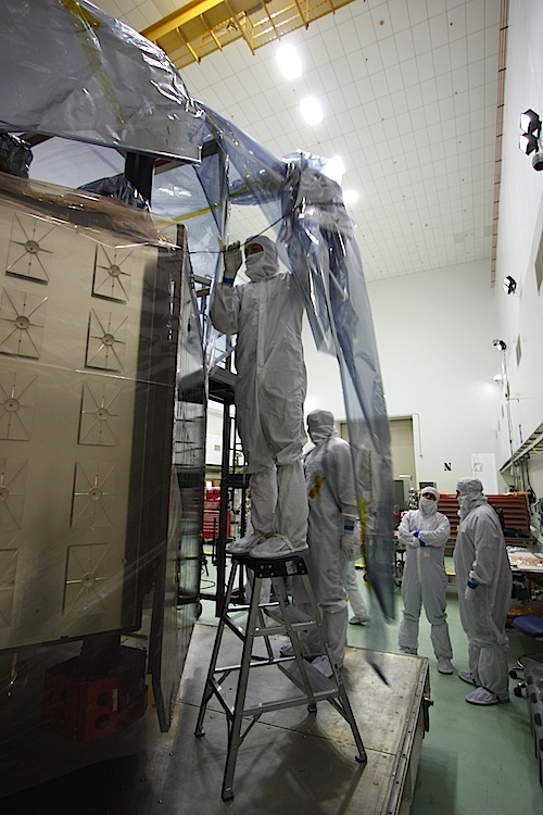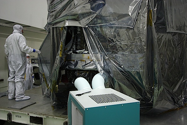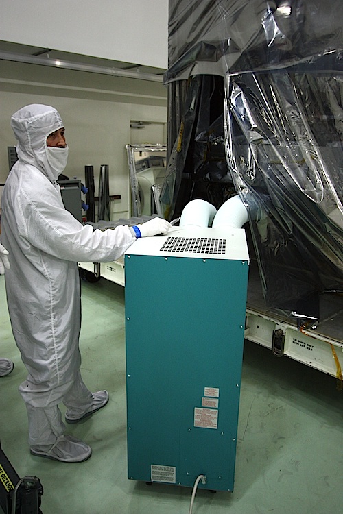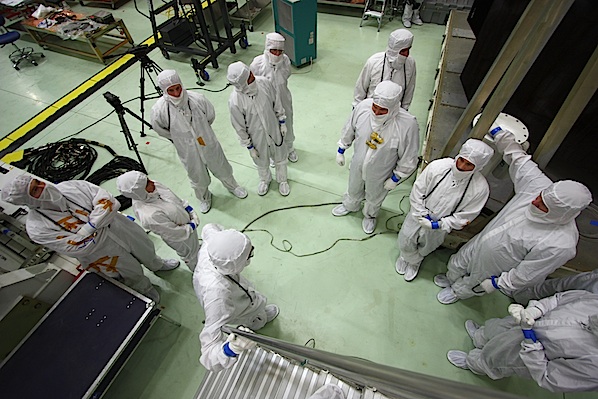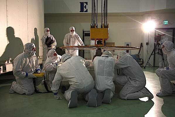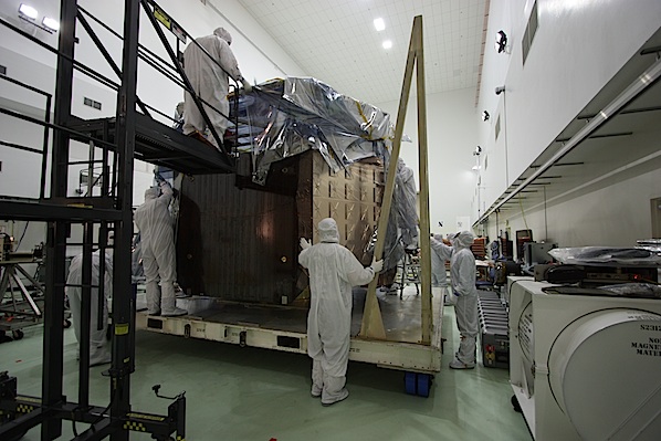Cranes first lifted the lid from the box containing Juno, then workers rolled the spacecraft into the clean room from an airlock chamber that received the probe when it arrived via truck. The next step was to remove the plastic shielding and packing material from the spacecraft while constantly monitoring for potentially high nitrogen levels in the atmosphere from the purge system used to keep Juno pristine during its cross-country journey.