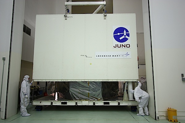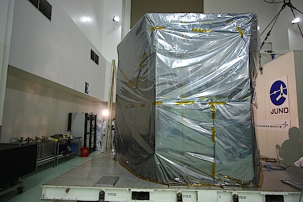 One day after it arrived in Florida, the Juno spacecraft was removed from its transport container Saturday and unwrapped of protective plastic at the Astrotech processing facility in Titusville, Fla.
