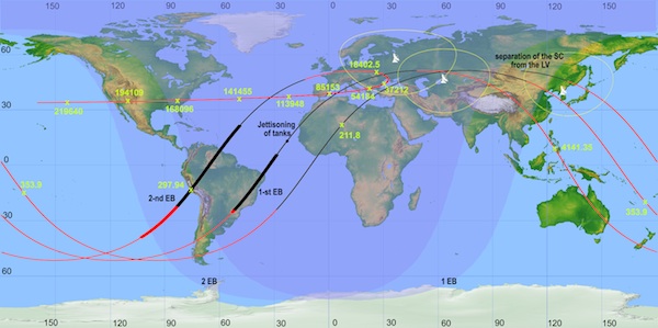 Both burns of the propulsion unit occur over South America out of range of ground stations in Russia. The bold black and red lines indicate the locations of the orbit-raising and Earth escape burns, which could be visible to observers in South America.